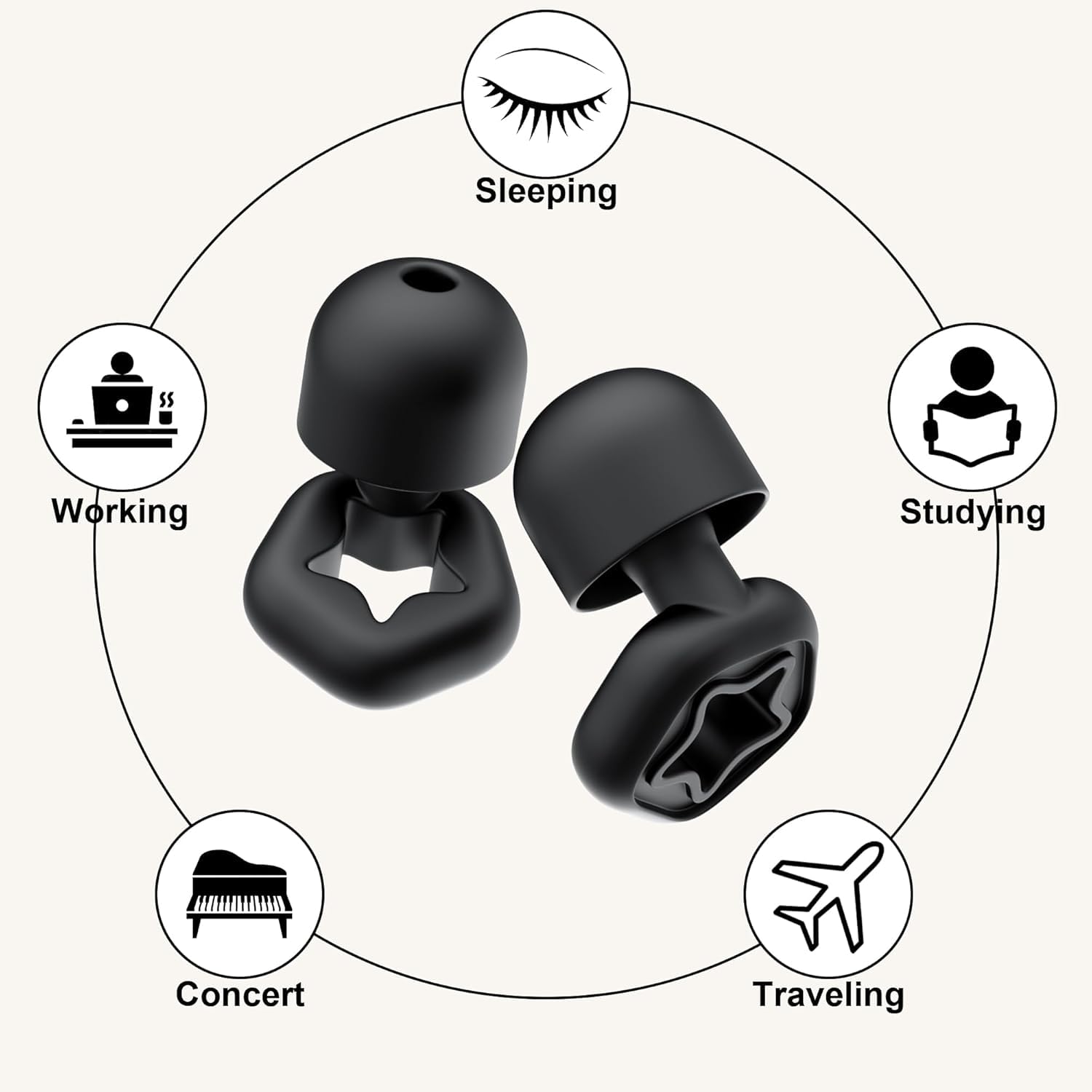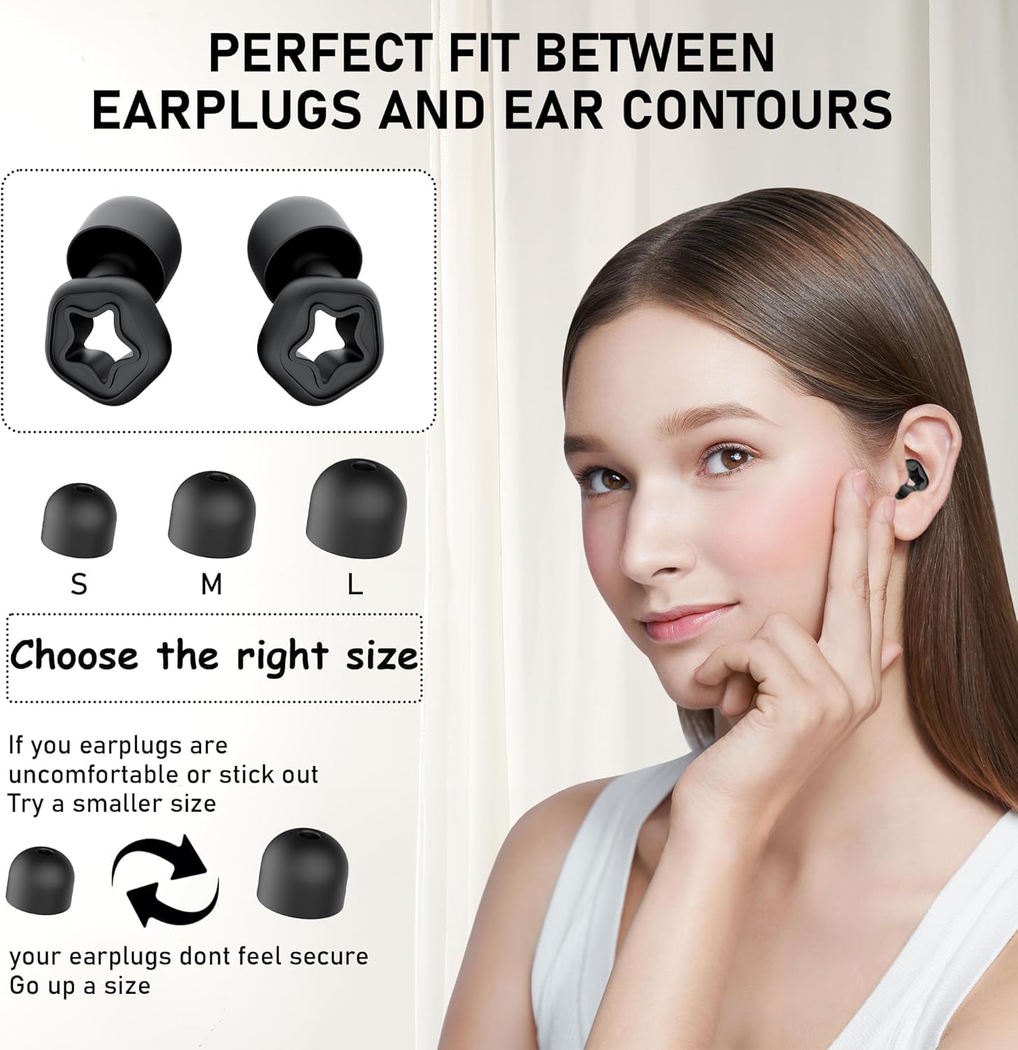 👂【Stylish & Fit】The gentle reusable earplugsare designed with a unique star-shaped ,both style and maximum comfort in mind. Each set comes with 3 pairs of sleeping noise reducation earplugs in different sizes (S/M/L) and 3 separate carrying cases to help you find the most suitable size,and making them the perfect travel companion.