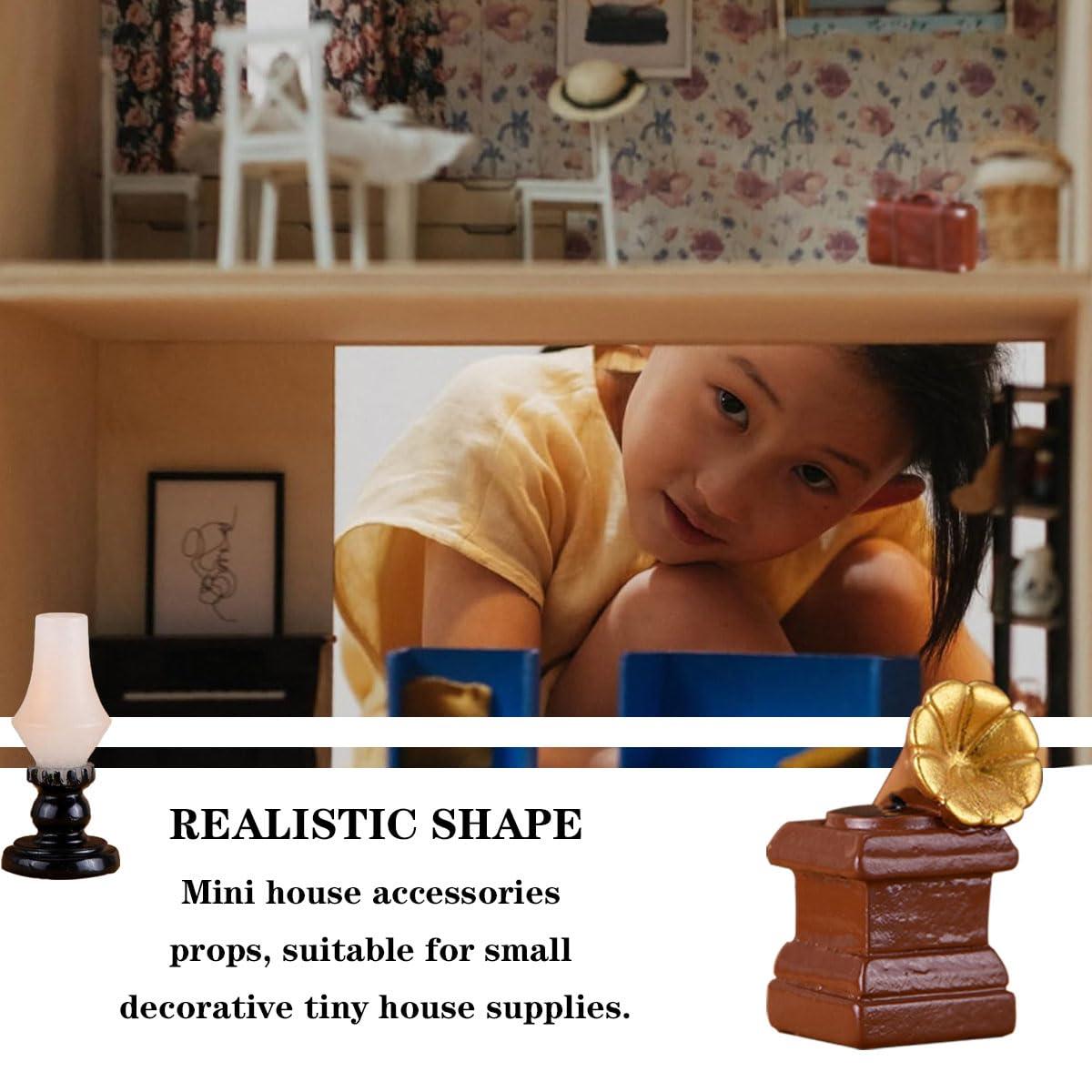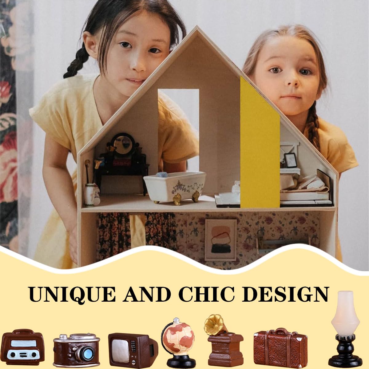 Unique Miniature Collection: This set features 7 intricately designed resin figurines including a gramophone, TV, radio, camera, suitcase, globe, and kerosene lamp; Each piece showcases vintage charm and detailed craftsmanship