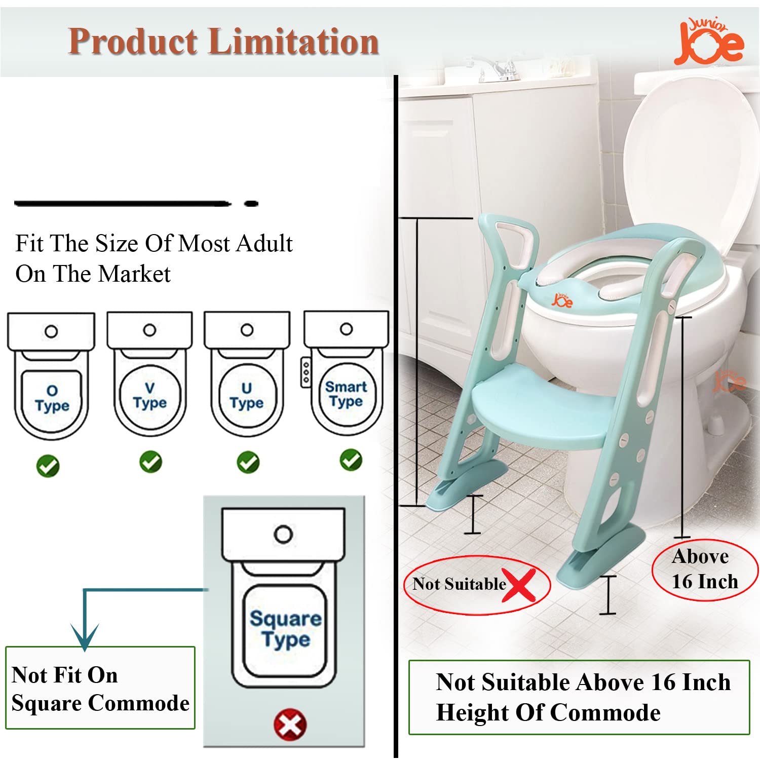 Suitable for most toilets 38-42cm/14.96-16.54inches high (From floor to porcelain)The toilet trainer may not stable and no longer be height-adjustable if its height below the toilet.Suitable for most kids, recommended age from 1 to 7 Years OldClean it regularly after use.
