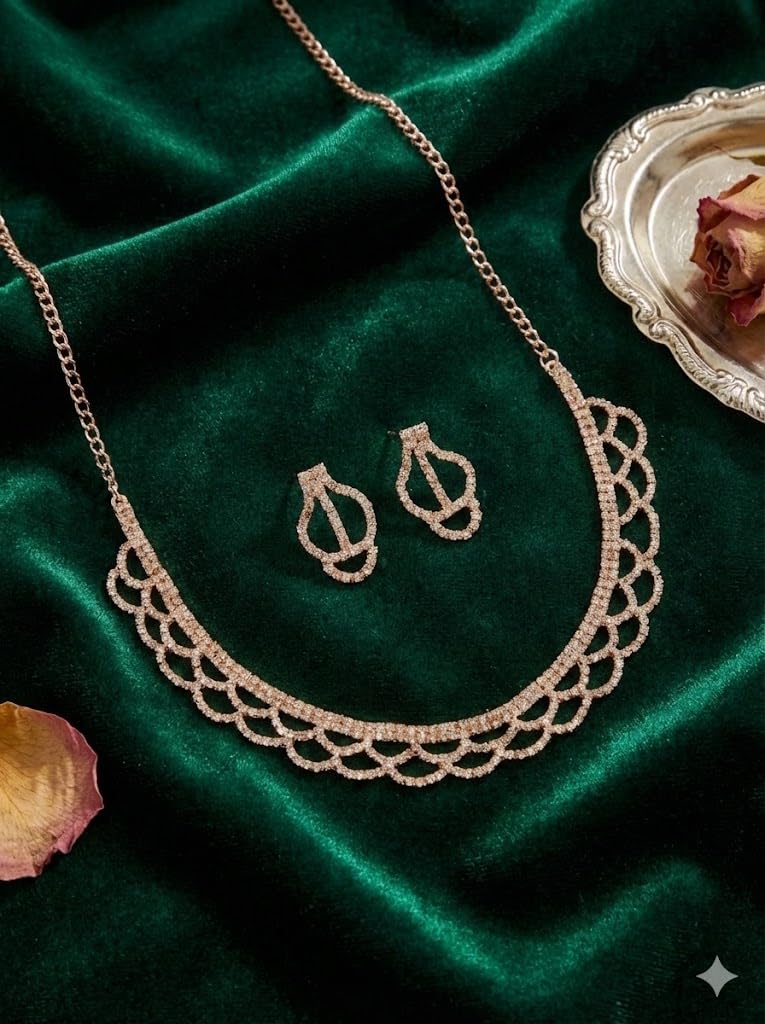 Experience elegance with this Rose Gold American Diamond Necklace Set for Women, crafted for those who appreciate premium fashion jewellery, modern design, and sparkling micro-stone detailing. The necklace showcases a beautiful scallop pattern adorned with crystal-studded AD stones, giving it a graceful, refined appearance. This set comes with coordinated earrings designed to match the necklace perfectly, creating a polished and stylish look that suits both ethnic jewellery styling and contemporary outfits. Made from high-quality alloy, finished in rose gold tone, and embellished with fine AD stones, this set offers a combination of durability, lightweight comfort, and premium shine. Its versatile design complements a variety of outfits, including sarees, lehengas, gowns, kurtis, and Indo-western wear, making it suitable for daily fashion, evening looks, and special styling moments. This beautifully designed necklace set also makes a wonderful addition to any artificial jewellery collection and is an ideal choice for gifting, thanks to its sophisticated design, fine detailing, and elegant finish. If you appreciate modern jewellery, statement pieces, and this set is an effortless way to elevate your look.