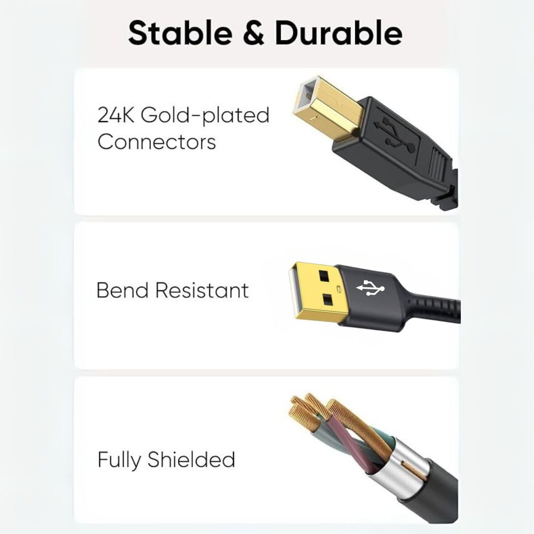 Superior Build Quality:- Crafted with high-purity copper wire, this cable features enhanced cores and shielding layers for robust performance. The nickel-plated connectors ensure a precise fit and stable, clear data transmission, enhancing your printing and scanning experience.