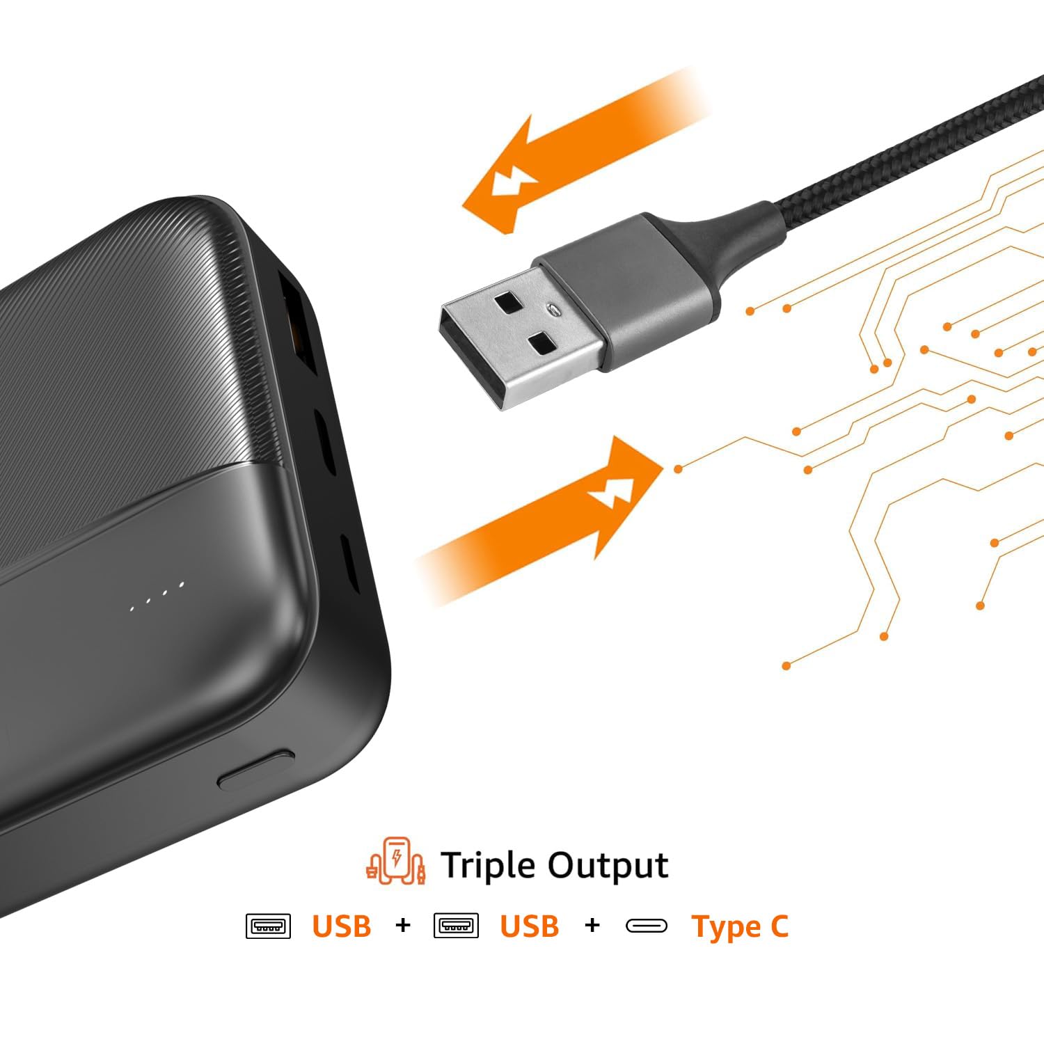 Introducing Amazon Basics 20000 mAh 22.5W Power Bank, your ultimate solution for fast charging all your devices. With dual output ports (USB-A & Type-C) and dual input ports (Micro USB & Type-C), this power bank supports bidirectional power delivery fast charging. It can charge three devices simultaneously, making it perfect for smartphones, TWS earbuds, speakers, and tablets. Charging cable included.