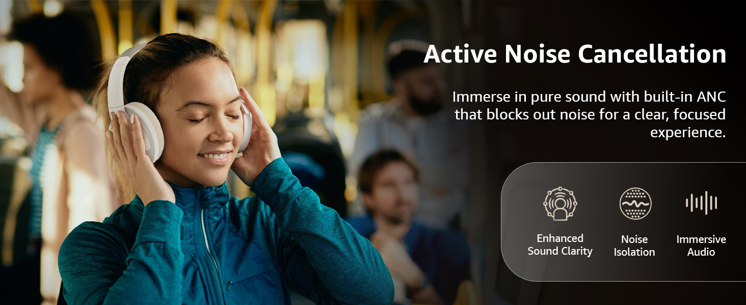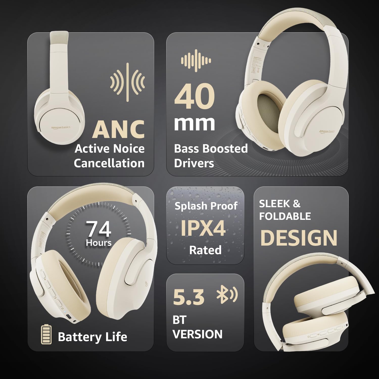 Amazon Basics Pro Series Wireless Noise Cancelling ANC Over Ear Headphone | Bluetooth Headset | USB Charging | 10 m Paring Distance | 74 Hours Battery Life | 40 mm Drivers | IPX4 Rated (Beige)