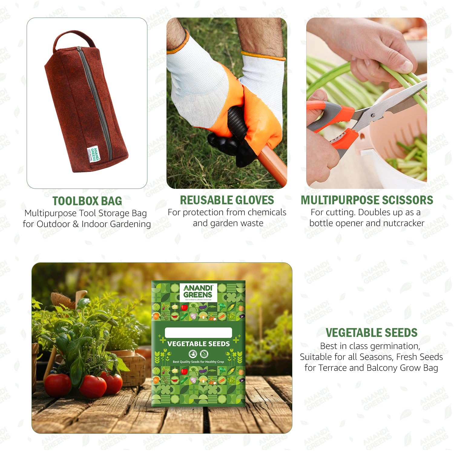 Anandi Green’s Metal Agriculture Gardening Tools Kit-10 Pcs (Cultivator, Fork, Trowels, Weeder, Garden Gloves, Pruner Cutter, Scissors, Seeds Packet, Tool packet) | Gardening Tools Set For Home Garden