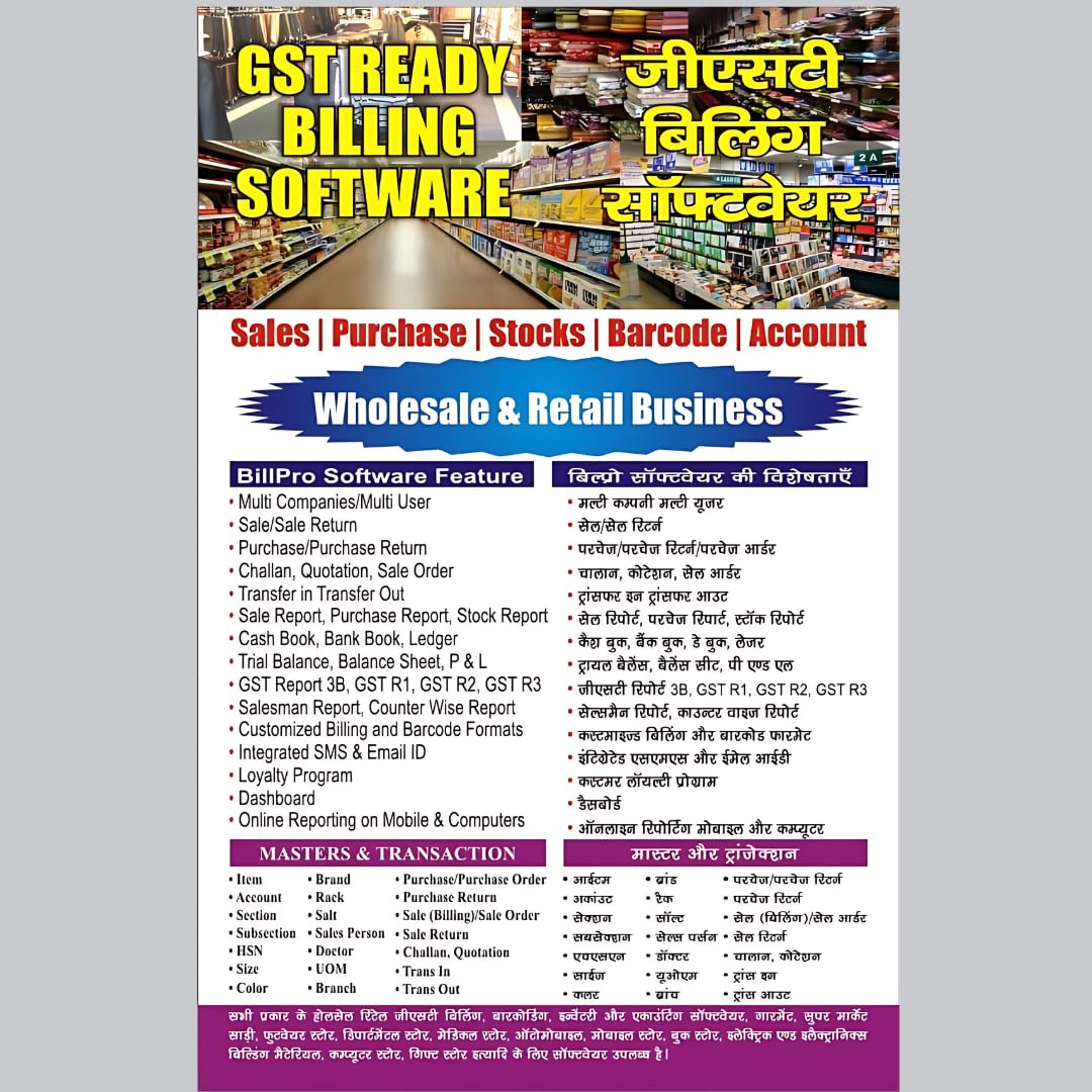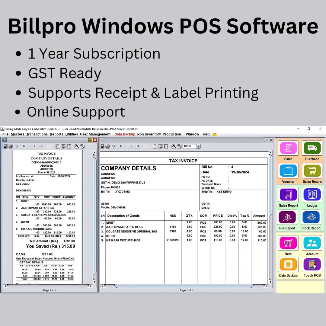 User-friendly Software: BillPro POS billing software is designed for efficient billing, inventory management, and reporting with a 1-year subscription included.