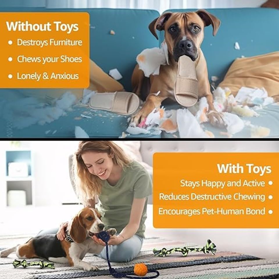TRAINING toys & Improve relationship: Tired dogs are happy dogs! Training make dogs physically fit and mentally sharp. Dogs love Chasing a training toy. When dogs learn to toss and roll dog treat balls to get their treats out. And various rope toys are great for tug. These pet toys positively enhance the relationship between you and your dogs.