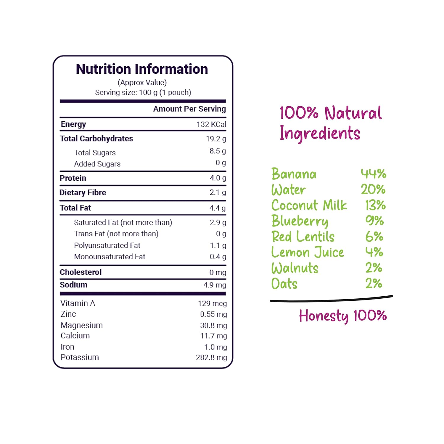 Baby Food Puree Pouch | 7+ Months | Banana Blueberry Coconut Oats Walnuts | 100% Natural, No Preservatives, No Sugar | 4g Protein, 4g Healthy Fats | Ready-to-Eat | Pack of 4, 100g each