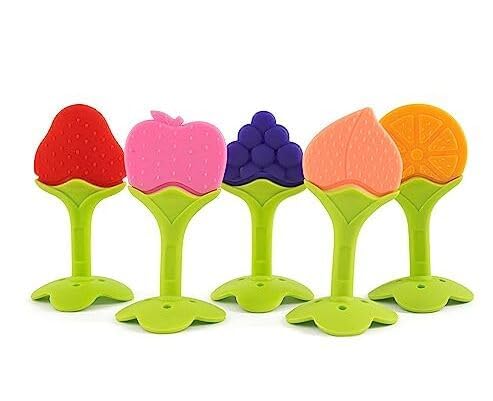 BabyGo Complete Baby Feeding Combo Set | Food Dispensing Spoon Bottle, Fruit Feeder Nibbler, Pacifier, Teether, Finger Toothbrush & Baby Bib | Set of 5 (Multicolor) | Essential for Baby’s Care