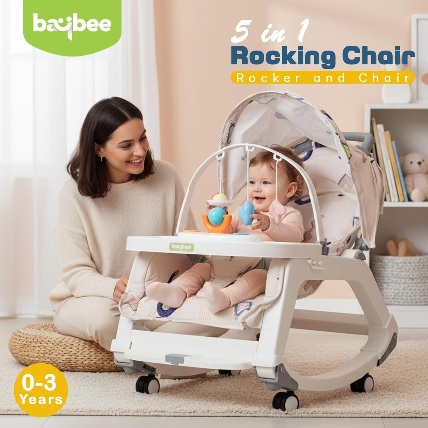 Baybee 5 in 1 Baby Rocker and Feeding Chair for Babies | Portable Rocking Chair for Kids with Parent Handle, Multi Position Recline, Food Tray & Music | Baby Bouncers 0 to 3 Years Boys Girls (Grey)