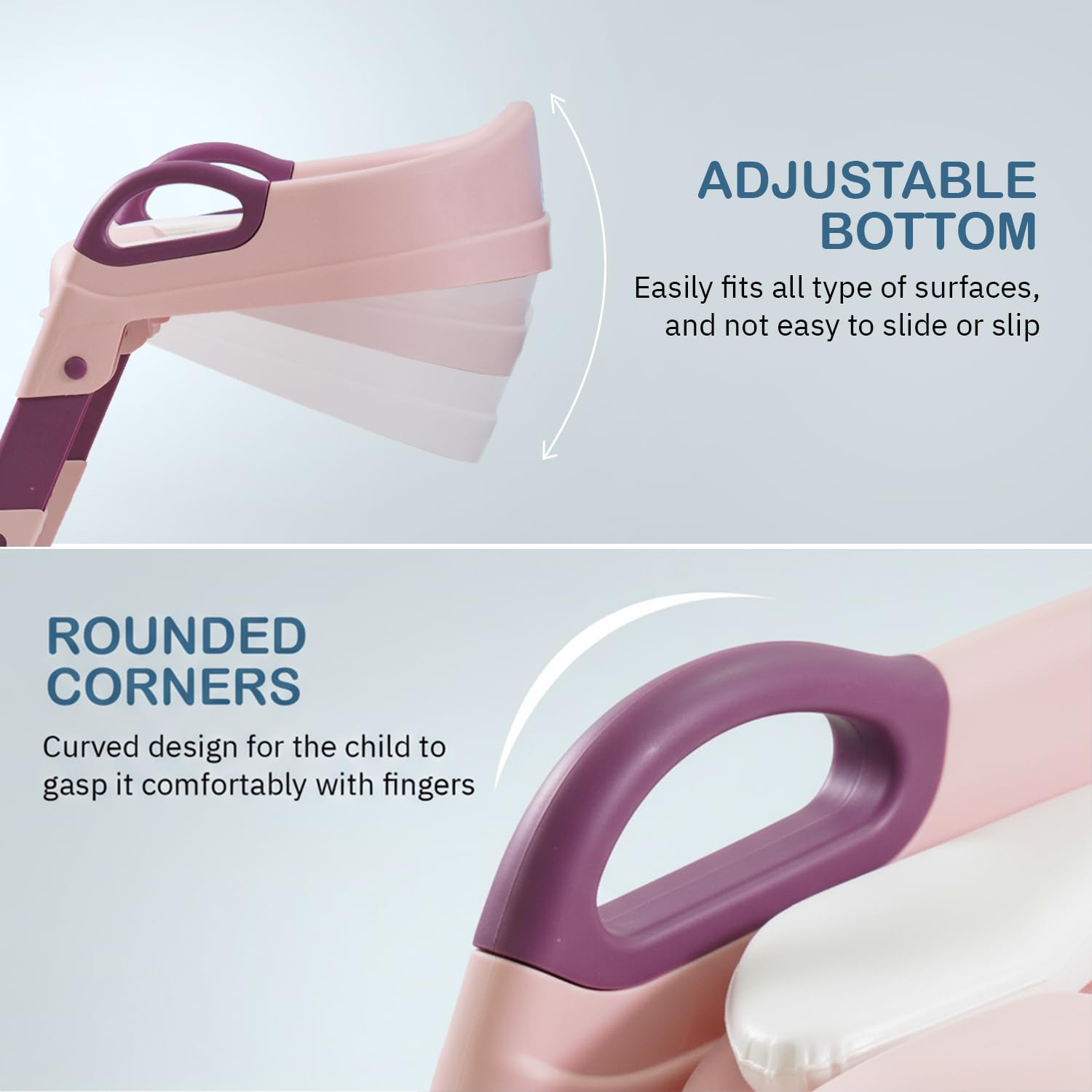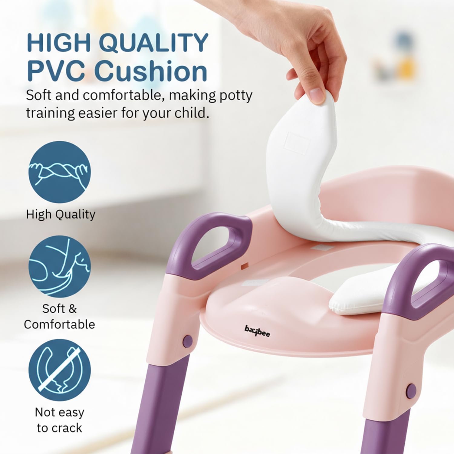 【Comfortable Seat & Handle】: The toilet training seat is equipped with smooth and large armrests that fit the curvature of the baby’s fingers, making it more comfortable and secure to hold. Soft removable cushion seat, to provide comfort to the baby.