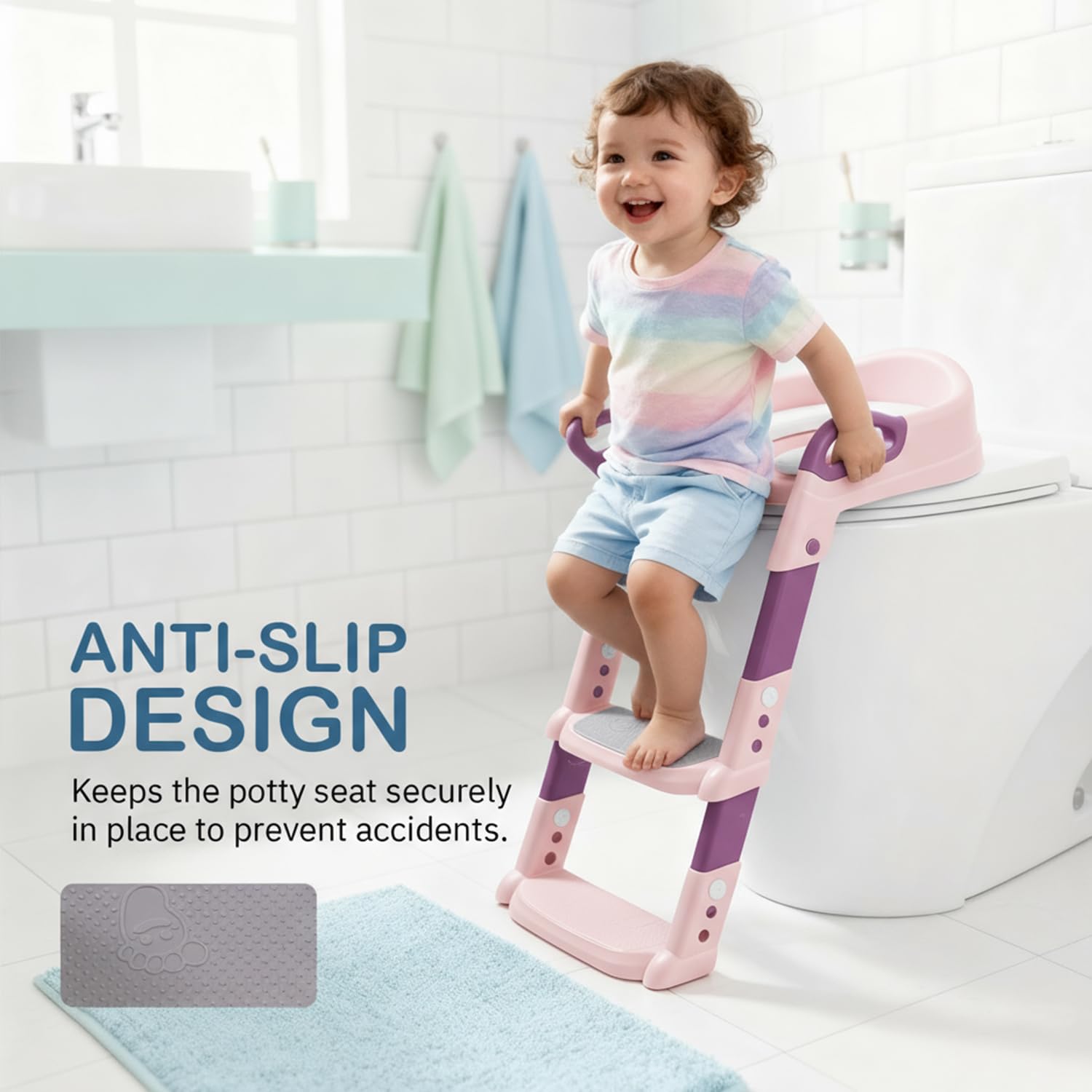【Safe and Durable】: This Potty seat is made up of safe and durable material. the potty seat with ladder for toddlers is safe to use with the Upgraded Anti-slip design for the footpads and ladder. That will prevent the toilet seat from shifting, which means your kids can climb up and down to use the toilet independently without worry.