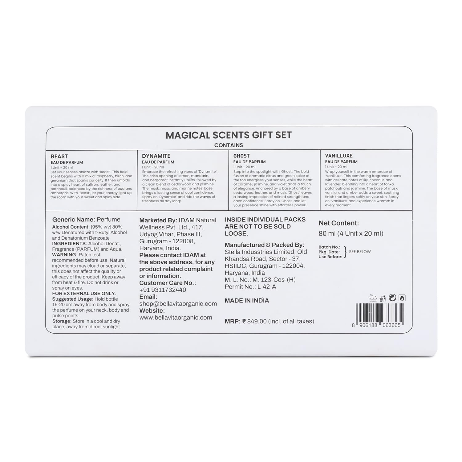 BELLAVITA Magical Scents 4x20ml | Long Lasting EDP Perfume Gift Set for Man and Woman | Vanilla, Caramel & Musk | Floral, Spicy Premium Fragrance for Men and Women
