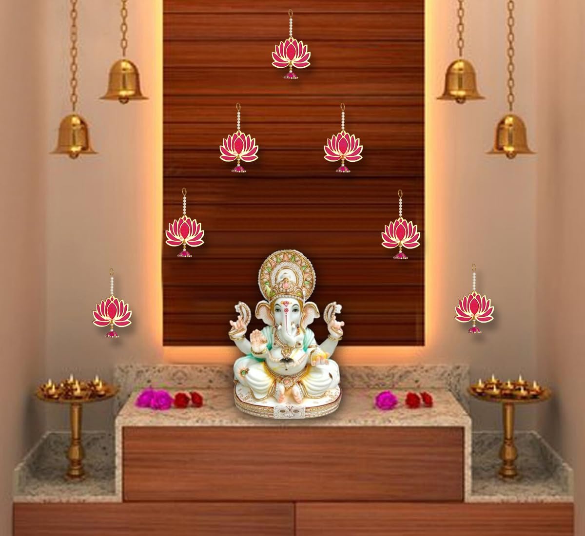 MDF Wood Handmade Jhumki Lotus Decoratives : This pack of 6 MDF handmade jhumki lotus toran decoratives is suitable for Ganesh Chaturthi, Ganapati Pooja, Diwali, and festive decor for door entrances and wall hangings.