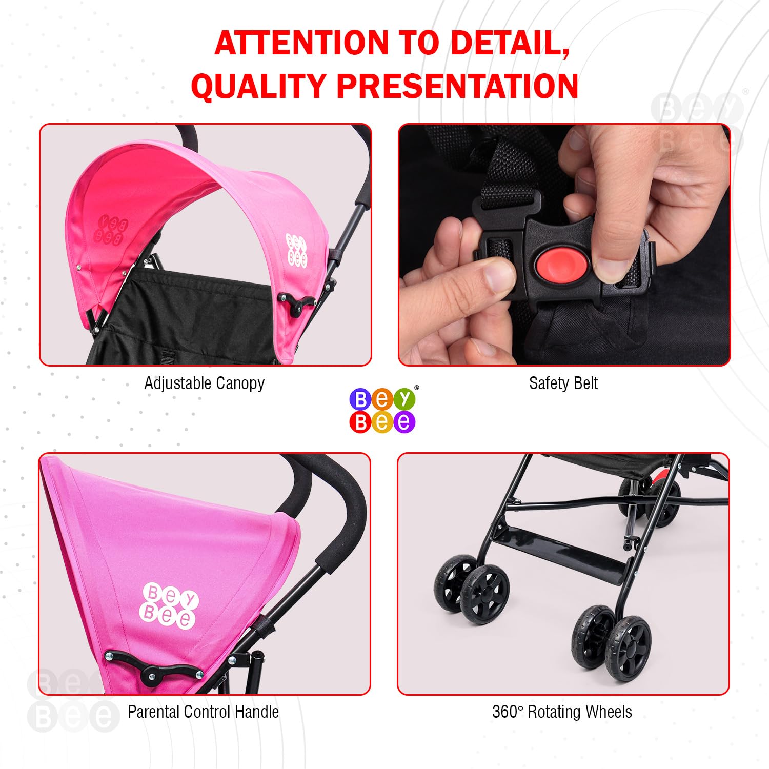 BeyBee Travel-Friendly Compact Baby Stroller Pram for Newborn Baby|with 5 Point Safety Harness, Adjustable seat Recline, with Canopy|Easy Foldable and Carry |Kids Age 0-2 Years, 15Kg Capacity (Pink)