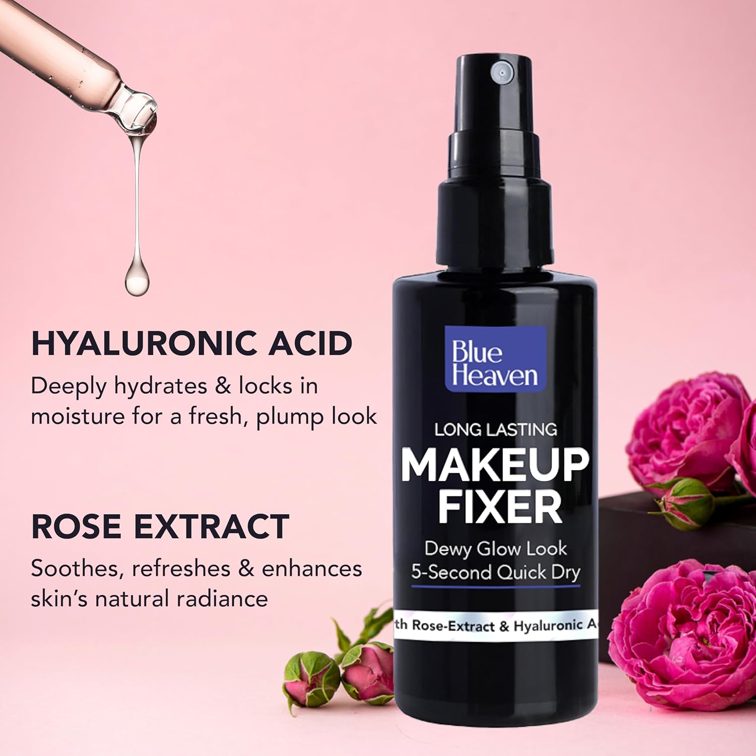 Blue Heaven makeup spray is a light weight, Non greasy texture that sets your makeup without melting or fading and leaving it intact for whole day.