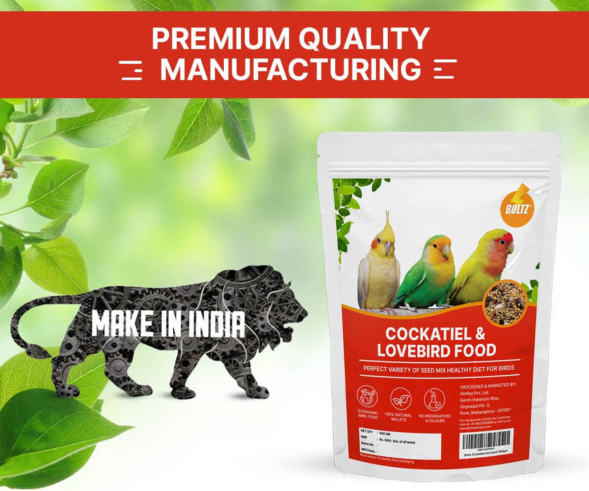 High Quality: Top quality food is the main source of energy,Vitamins and Minerals for Cockatiel and LovebirdsVariety Of Seeds: Boltz bird food is prepared with perfect variety of seed mix.Carefully mixed seeds, is natural, clean, convenient and easy to use foodHealthy Feather: Excellent for Cockatiel and Lovebird’s feather healthNo Chemicals: Boltz bird food is pure natural food. It does not contain any chemicals and artificial colorsEasily Digestible: Boltz bird food contains Cockatiel birds favorite canary seeds and striped sunflower seed. It is easy to digest and avoid any digestive system problems