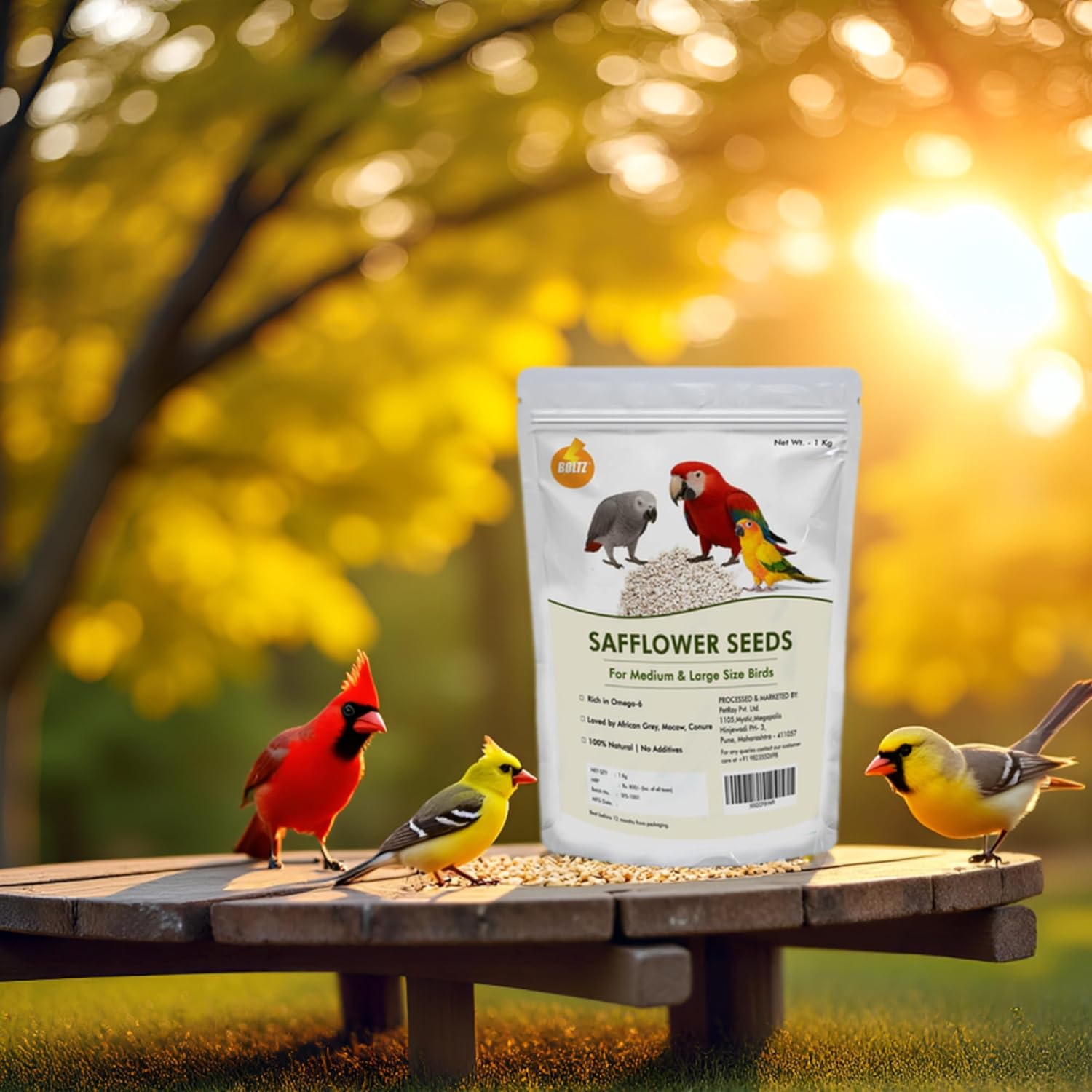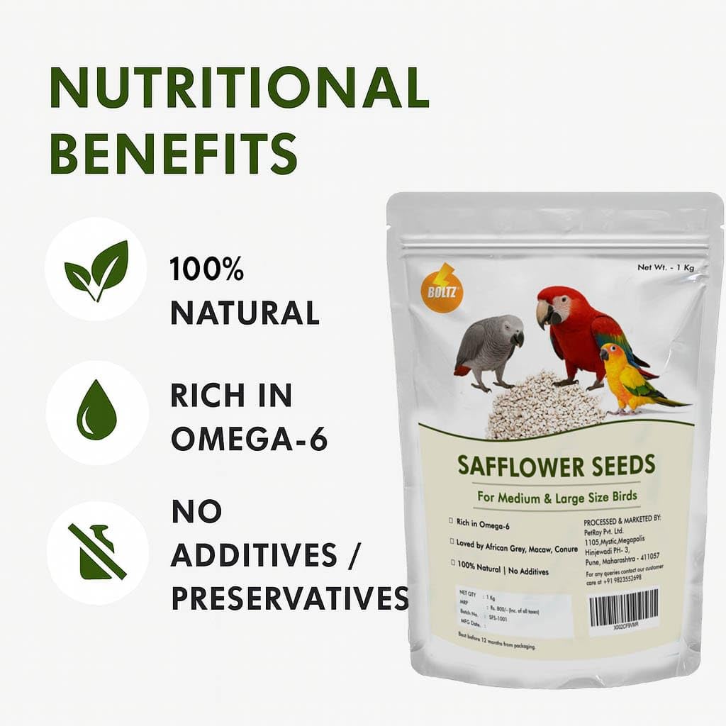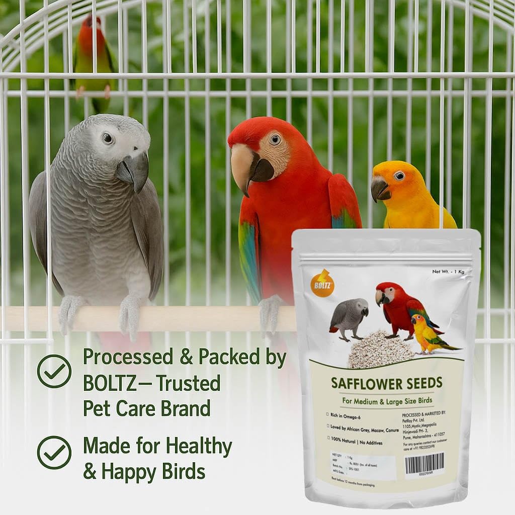 Boltz Safflower Seeds for Birds – 1 Kg Premium Bird Food for Parrots, Doves, Cockatiels, Cockatoos & Cardinals, High Protein & Oil-Rich, Raw & Natural Seeds – No Fillers, Fresh & Clean