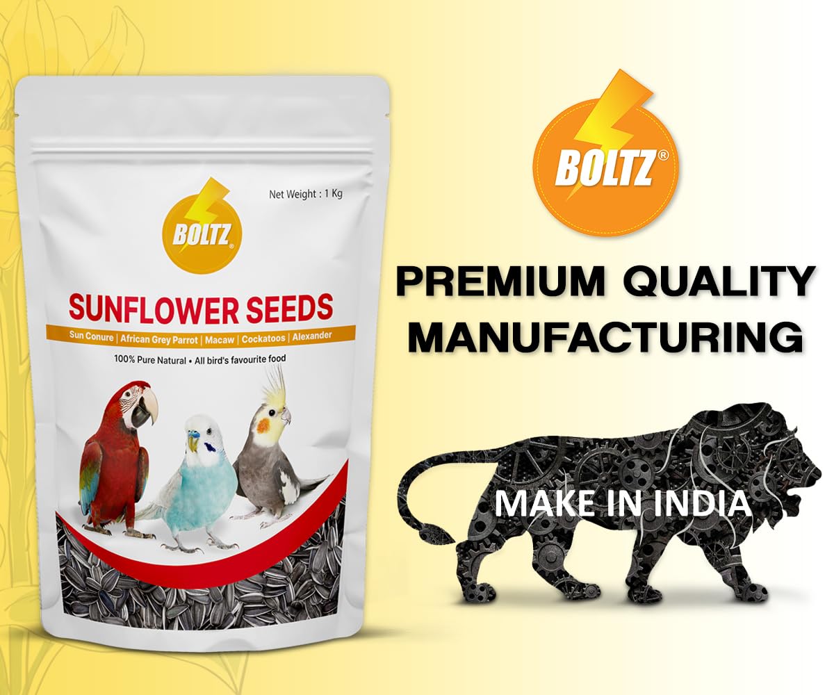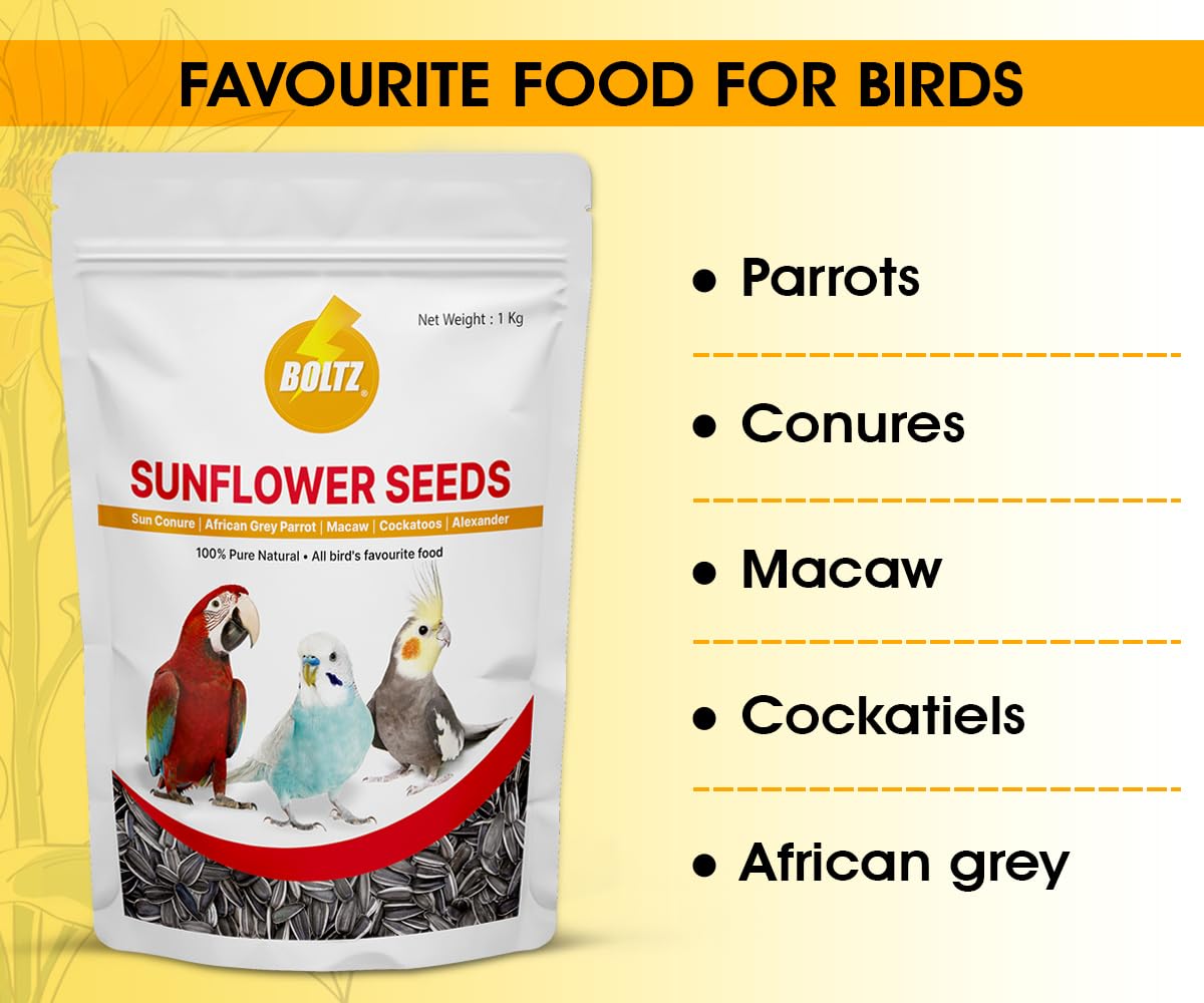 BIRDS FAVORITE SEED: Boltz sunflower seeds are favouite for all Budgies, Lovebirds, Cockatiels, Sun Conure, Green Cheek Conure, African Grey, Amazon, Macaws, Cockatoos etc