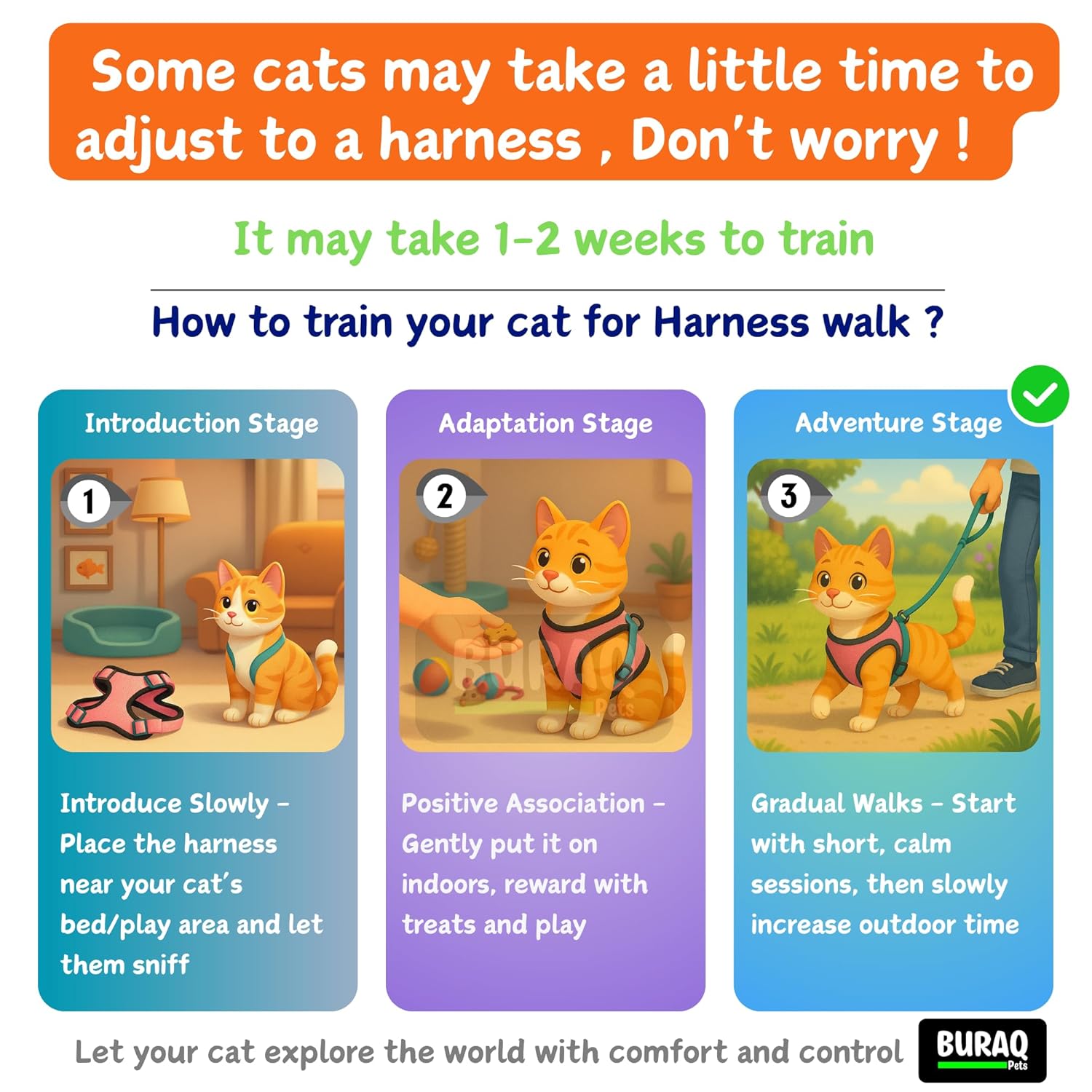 How to Train Your Cat for Harness Walks – 1) Start by introducing the harness with treats and play 2) Let your cat wear it indoors to build confidence 3) Gradually transition to short, supervised outdoor walks in a safe and quiet space.