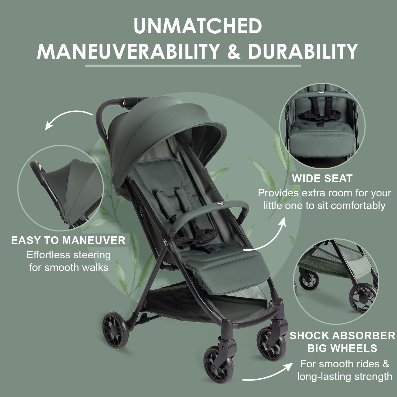 Chicco Urbino Evergreen Stroller |One-Hand fold| Comfortable Wide Seats with Padded Shoulder| Reclining backrest and Adjustable footrest|0-4 Years| Extendable Canopy with UV 50+ Protection