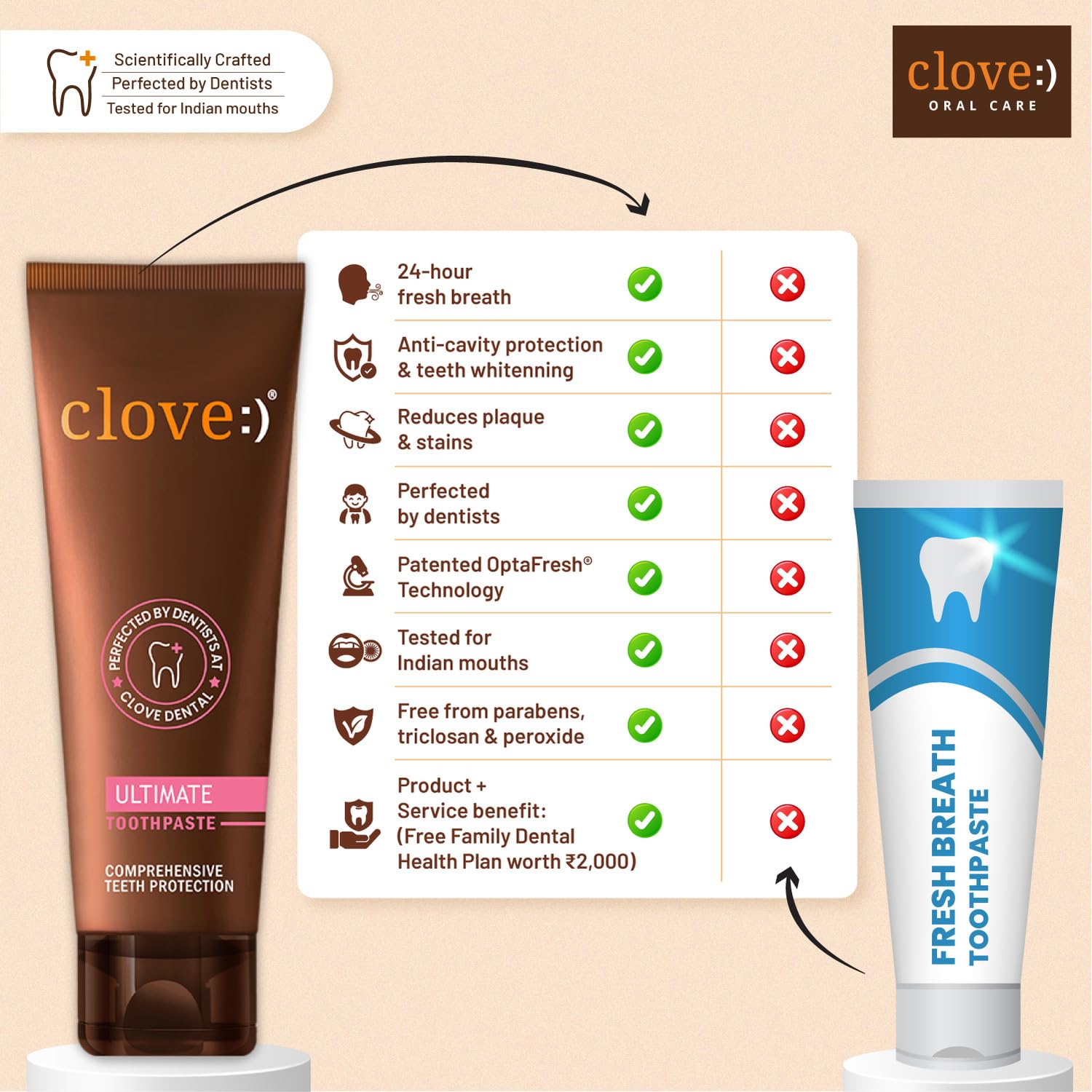 Clove Ultimate Toothpaste , FREE Family Dental Health Plan ₹2000, Patented Optafresh Technology , 24-Hour Active Freshness & Bad Breath Control , Cavity Protection & Healthy Gums ,Safe formula, Mint, Pack of 1 (100g)