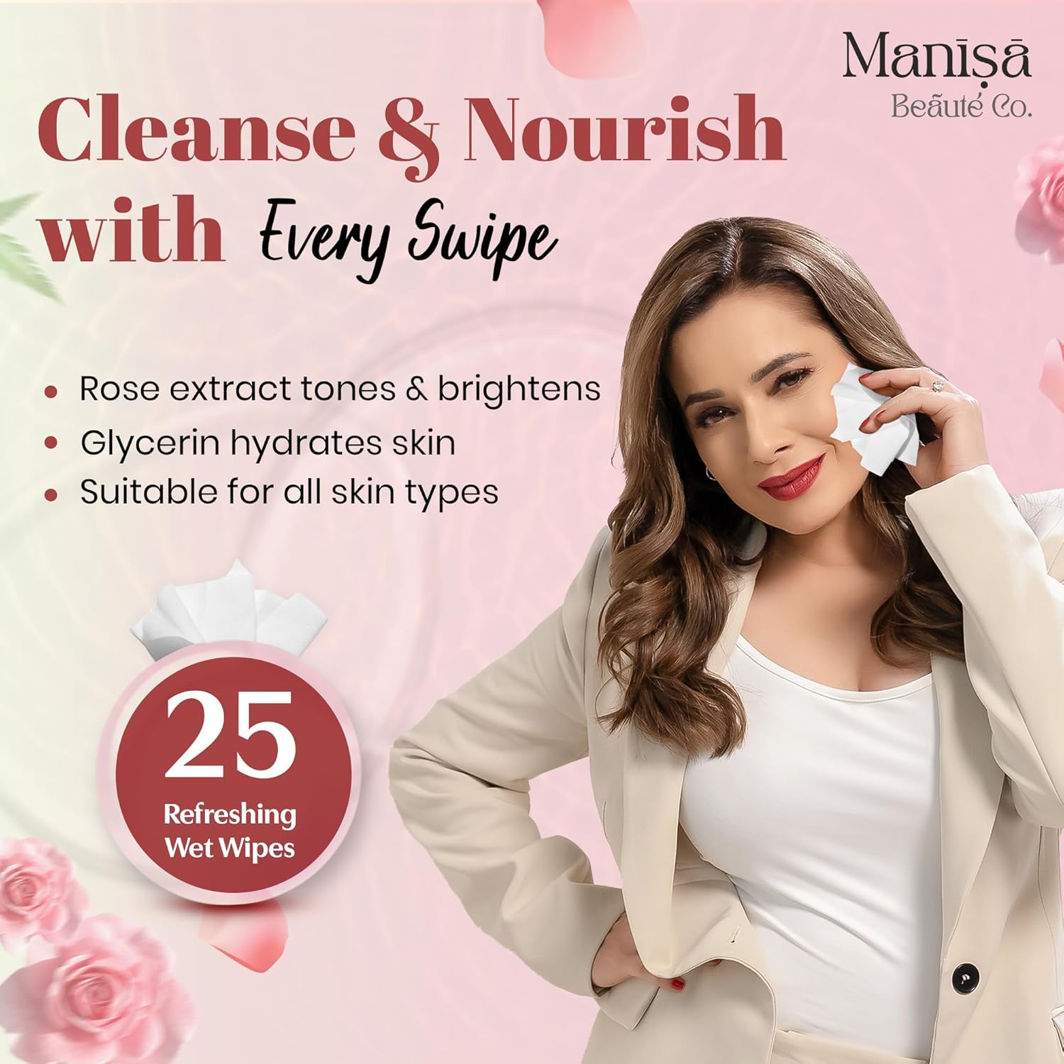 Rose Extract for Skin Soothing : Infused with natural rose extract, these wipes not only cleanse but also calm redness, hydrate, and tone your skin. The botanical properties of rose water promote a healthy, radiant complexion while delivering a subtle floral aroma. Ideal for makeup removal after work, travel, or events, giving your skin a gentle touch of luxury.