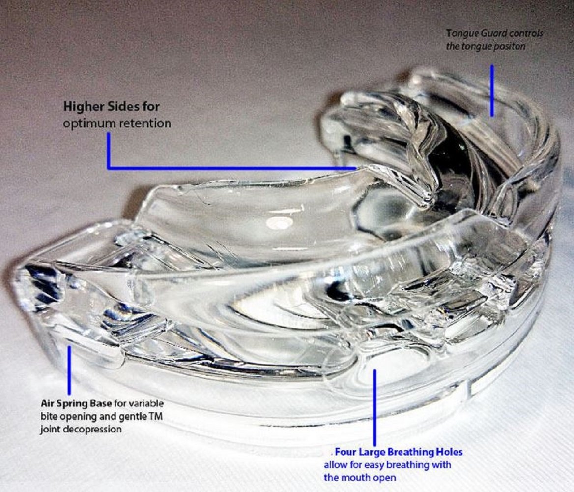 This mouth guard features four large breathing holes and a thicker base with air spring for increased bite opening and gentle TMJ decompression.The higher sides improve retention while sleeping and the tongue guard control the tongue position.