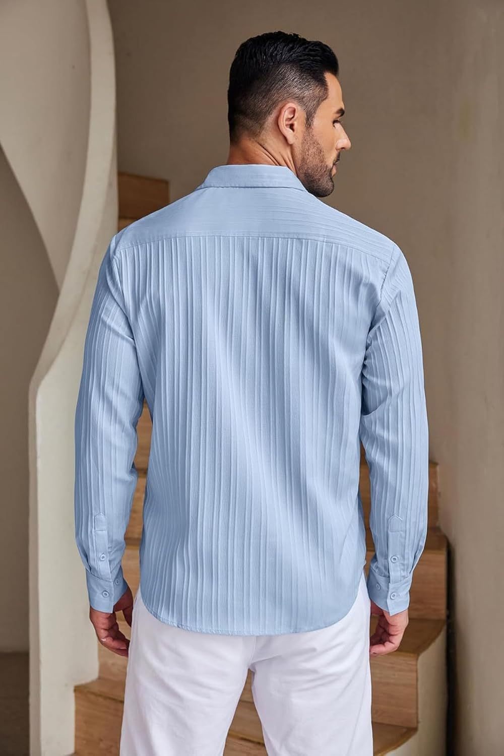 DEELMO Men’s Casual Button Down Shirts Long Sleeve Linen Shirt Fashion Textured Beach Summer Shirt