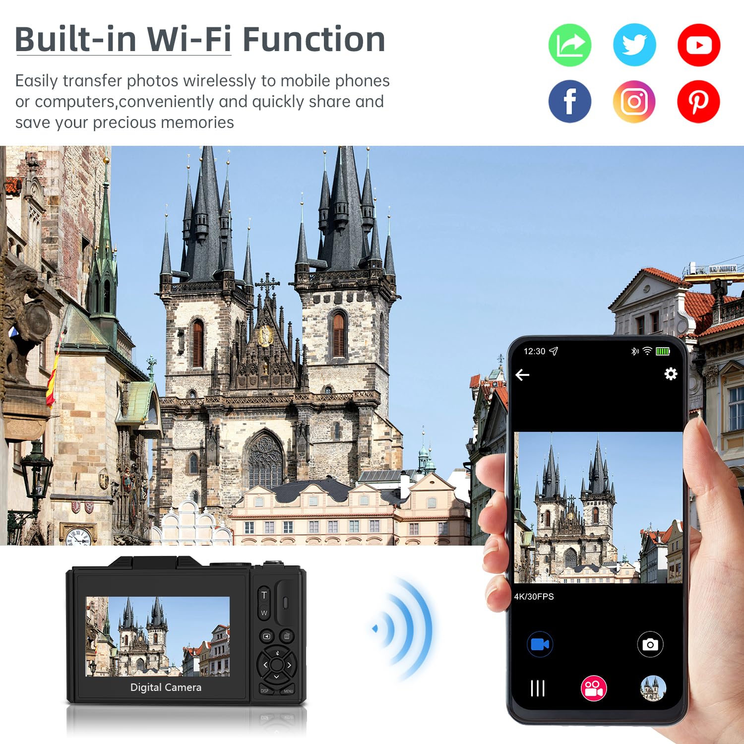 【4K Video & 180° Flip screen】 The Video camera supports 4K video recording, providing smooth, hight-quality video with autofocus to keep your shots clear. The 3-inch 180° flip screen simplifies shooting, especially for selfies and vlogs, with easy-to-understand menu controls. You can quickly adjust settings different modes and shooting angles, making it ideal for travel photography and casual everyday use