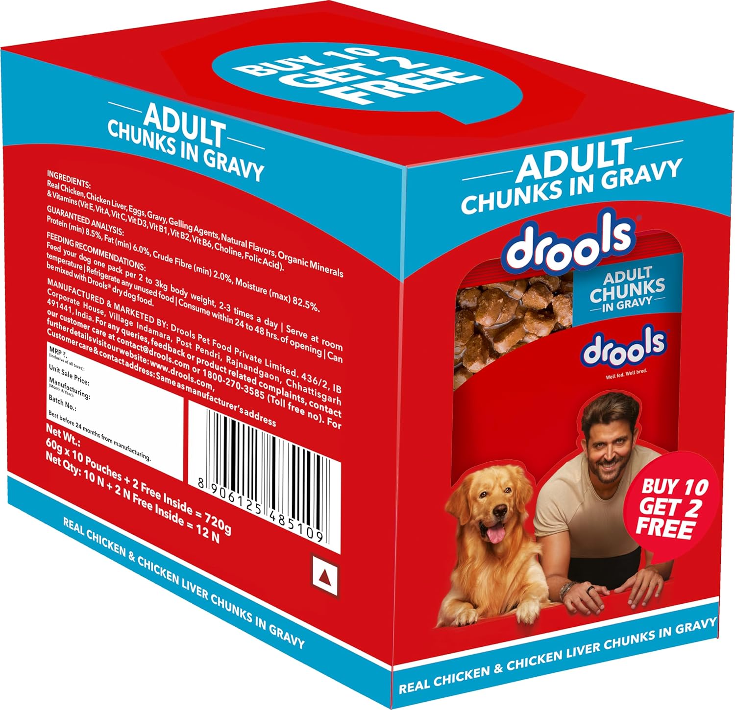 Drools Adult Wet Dog Food, Real Chicken and Chicken Liver Chunks in Gravy,10 Pouches + 2 Pouches Free (12 x 60g)