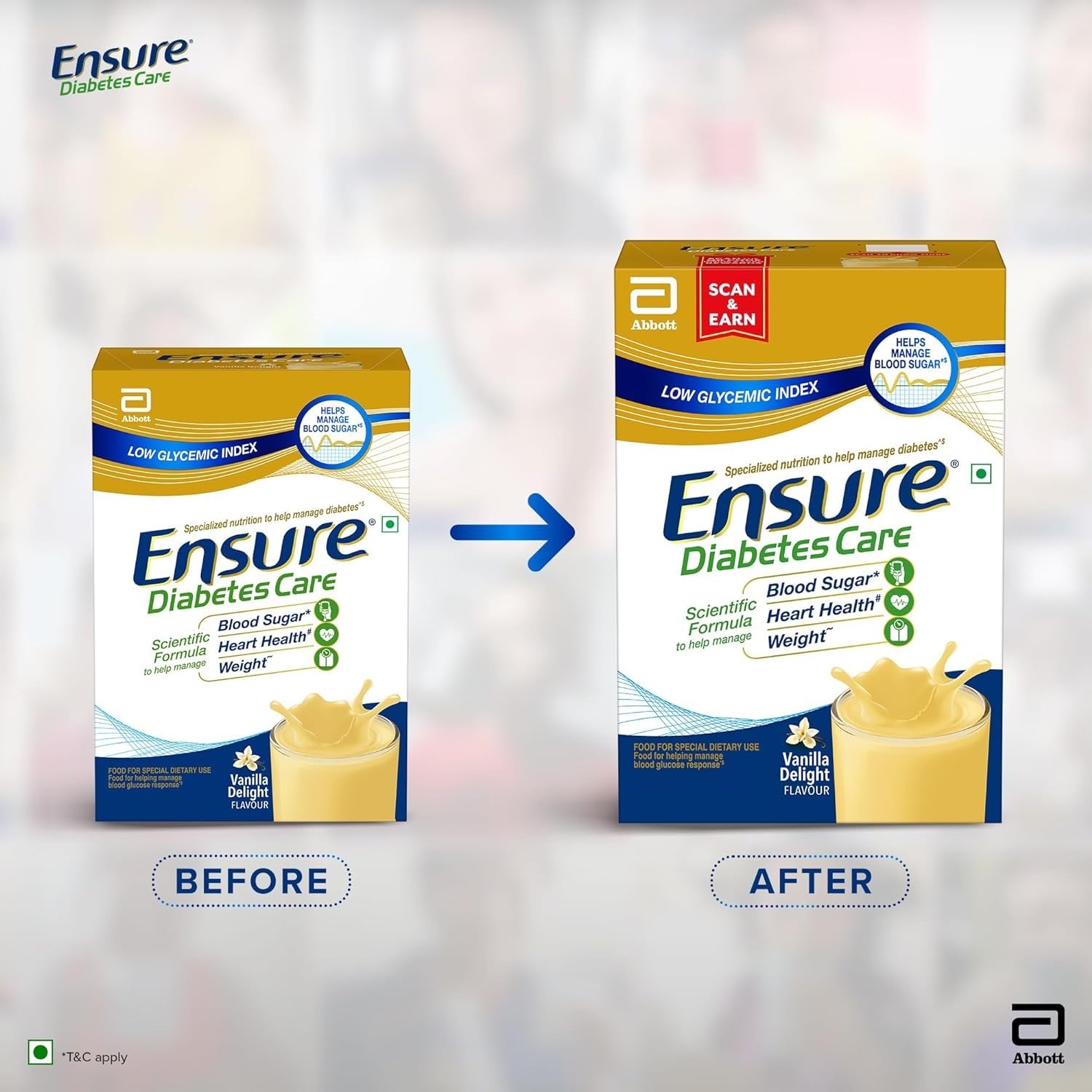 Ensure diabetes care is a diabetes specific nutrition. It is sugar (sucrose) free, has protein and balanced ratio of protein:carbs:fat along with micronutrients to support overall health. When included in diet as partial meal replacement either in breakfast, lunch or dinner, it can help to keep blood glucose and weight under control. It contains nutrients which help provide steady carbs build muscle mass heart health digestive health.