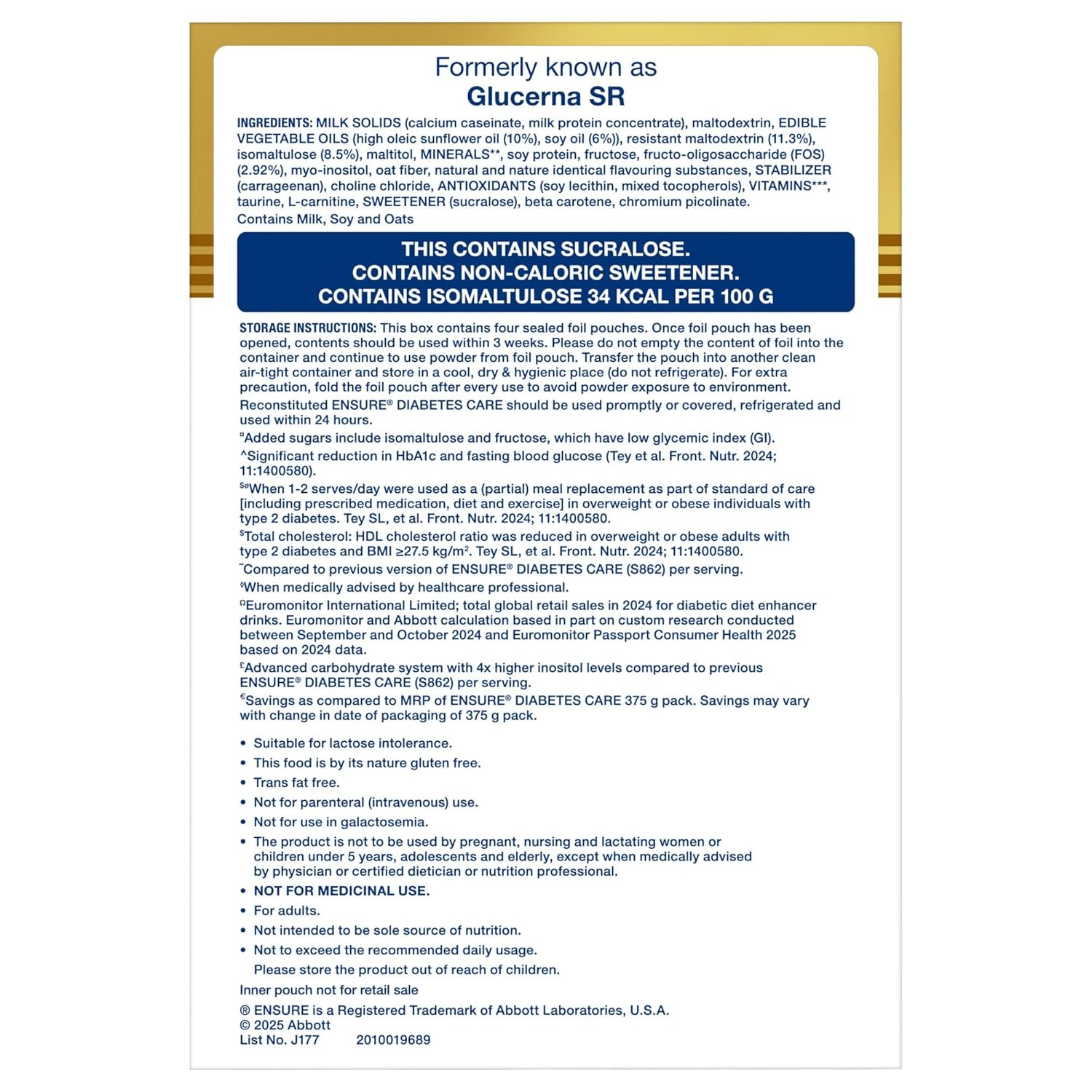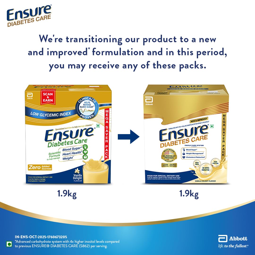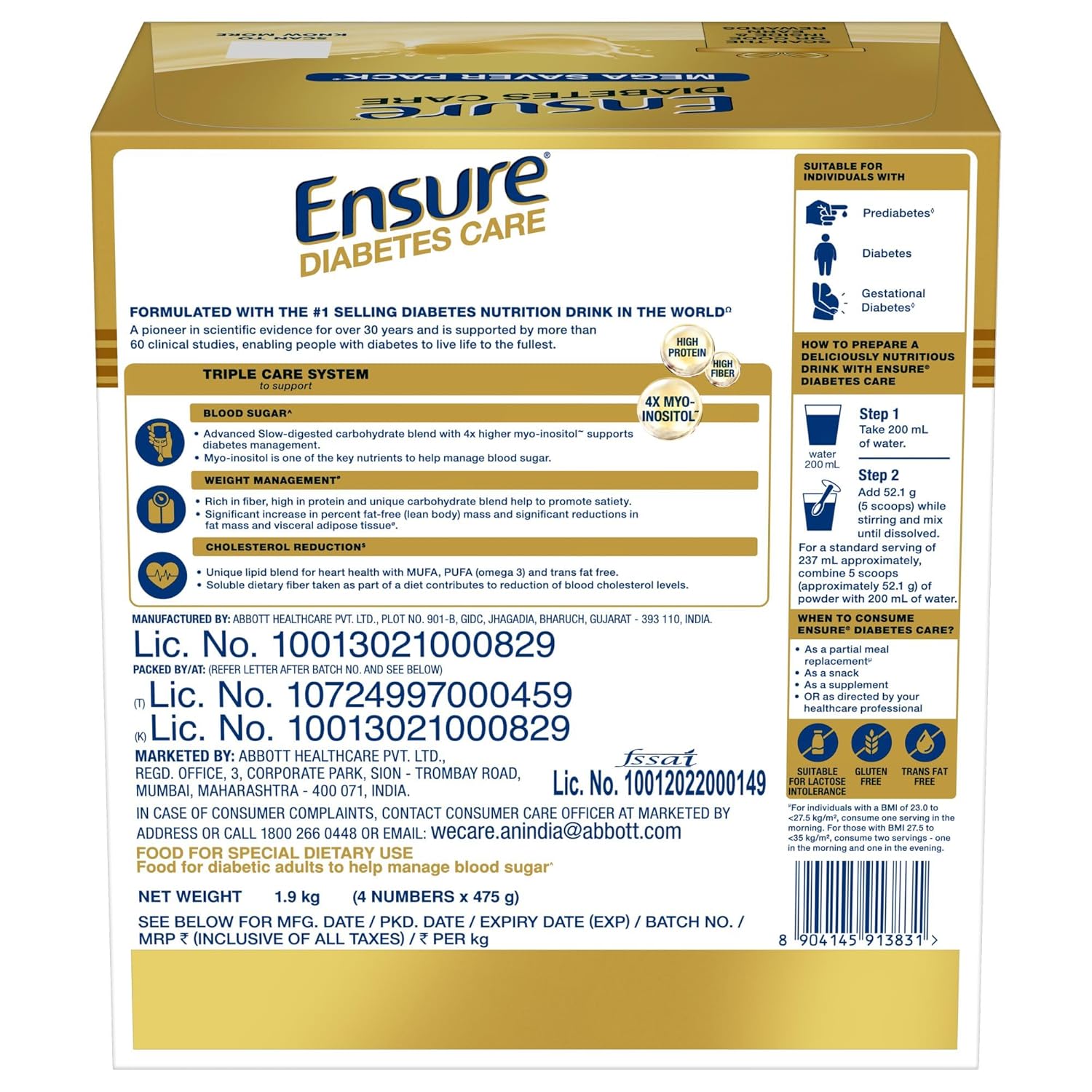 Ensure Diabetes Care : The World’s No. 1 Diabetic Nutritional Supplement Backed by +60 clinical trials & Abbott +50 Years Legacy in India. It is specially formulated to aid diabetics in managing blood sugar levels in 4 weeks. With 36 nutrients – including high protein, fiber, vitamins , minerals and low-fat & slow-release carbohydrates – this supplement promotes heart health, provides steady energy throughout the day, supports strength and mobility while also regulating blood sugar levels. It helps Manage Blood Sugar Levels and Diabetes Symptoms like: Helps Reduce Fatigue: High Quality Protein & other nutrients (Protein, B Complex vitamins, Vitamin C, Iron, Magnesium and Energy) help in deliver steady energy to combat daily fatigue. Helps Manage Hunger Pangs: High fiber and advanced slow-release carbs provide lasting satiety (It helps in reduction of fasting, post-prandial blood glucose, glycemic variability and HbA1c levels). Thus, reducing Hunger pangs Supports Weight Management: Designed to aid weight management when used as 1- 2 serves per day as partial or complete meal replacement as a part of diabetes management plan of diet advice & exercise in over-weight diabetic adults