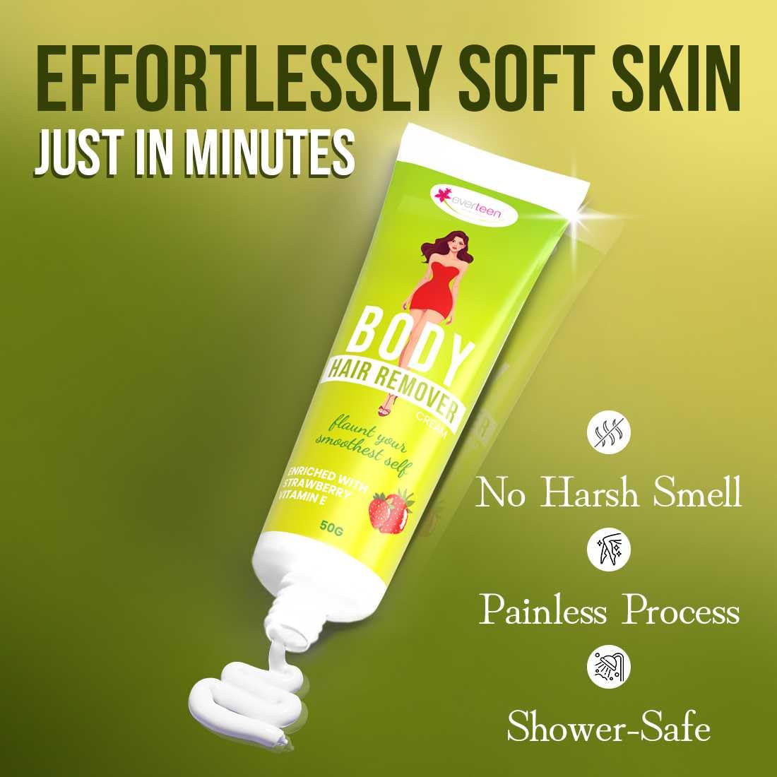 STRAWBERRY BODY HAIR REMOVER CREAM : everteen Body Hair removal cream is enriched with the goodness of Strawberry Extracts, Vitamin E, Almond Oil, and Allantoin, this hair removal formula not only removes unwanted hair effortlessly but also pampers your skin with deep nourishment.