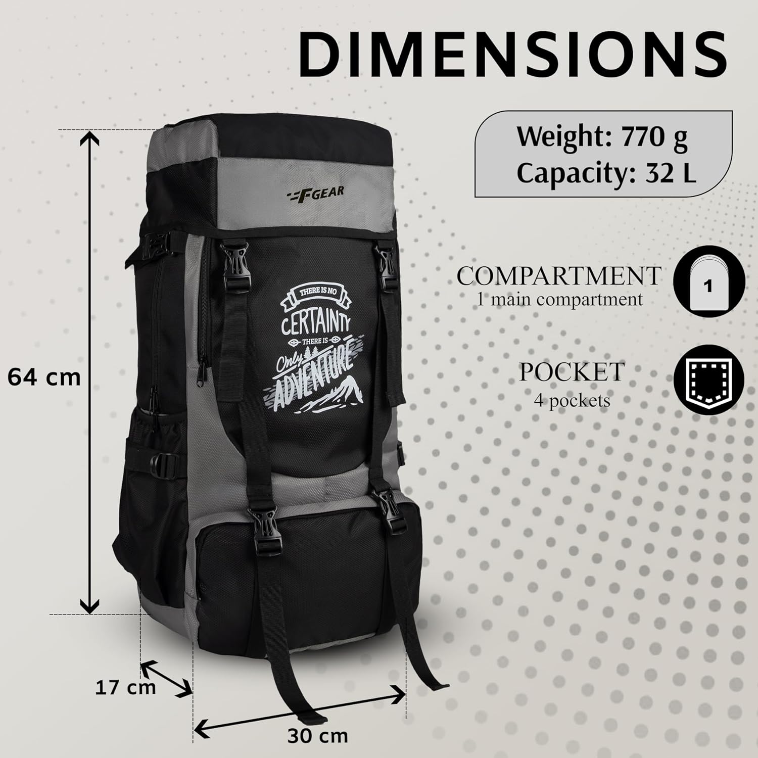 F Gear Ridge Black 32L Trekking Backpack|Hiking|Camping Travel Leisure Tourist Outdoor Sport Rucksack|Multi Pockets|Shoulder Bag – Drawstring Top Open|Lightweight Bag|Adults|Unisex|Men Women
