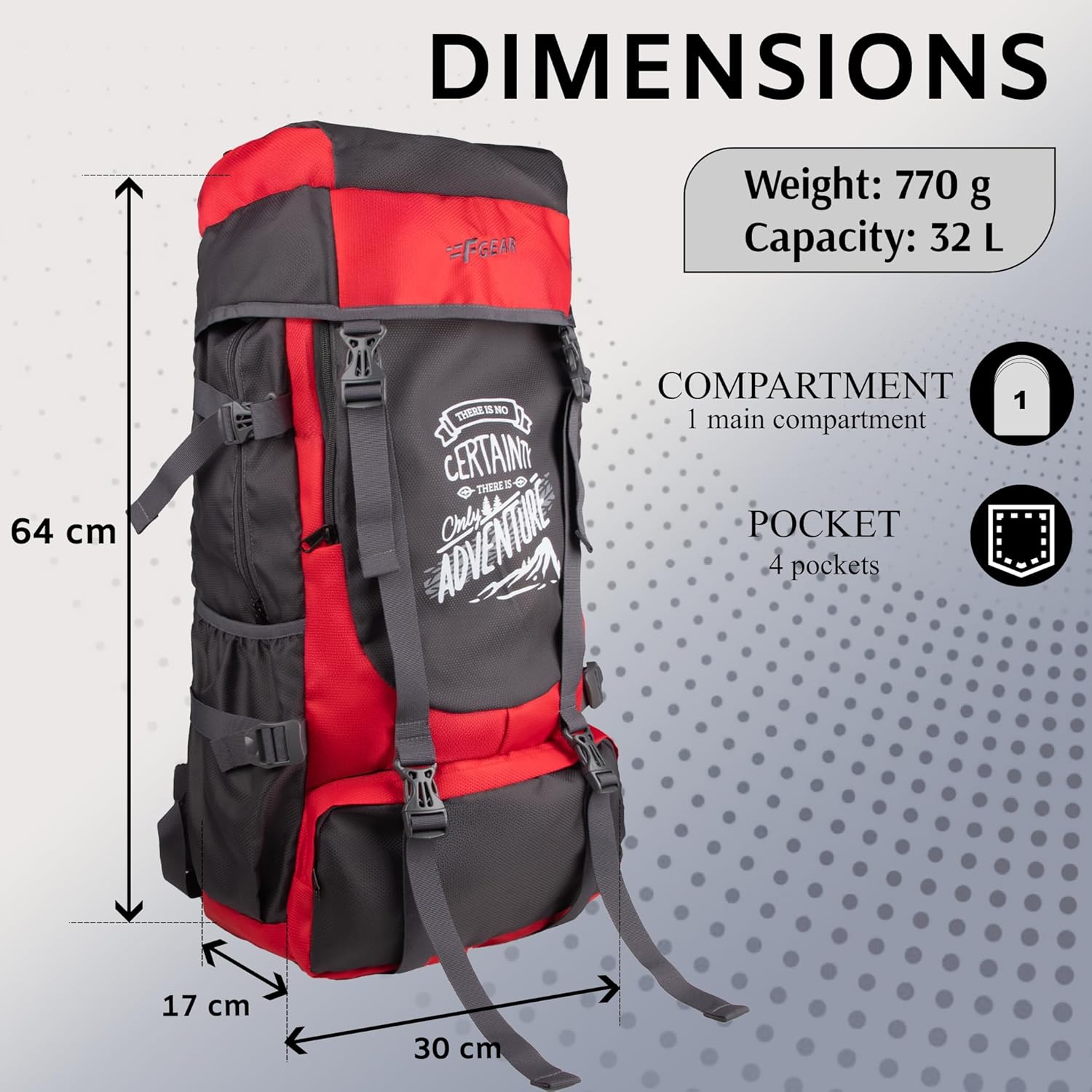F Gear Ridge DK Grey 32L Trekking Backpack|Hiking|Camping Travel Leisure Tourist Outdoor Sport Rucksack|Multi Pockets|Shoulder Bag – Drawstring Top Open|Lightweight Bag|Adults|Unisex|Men Women
