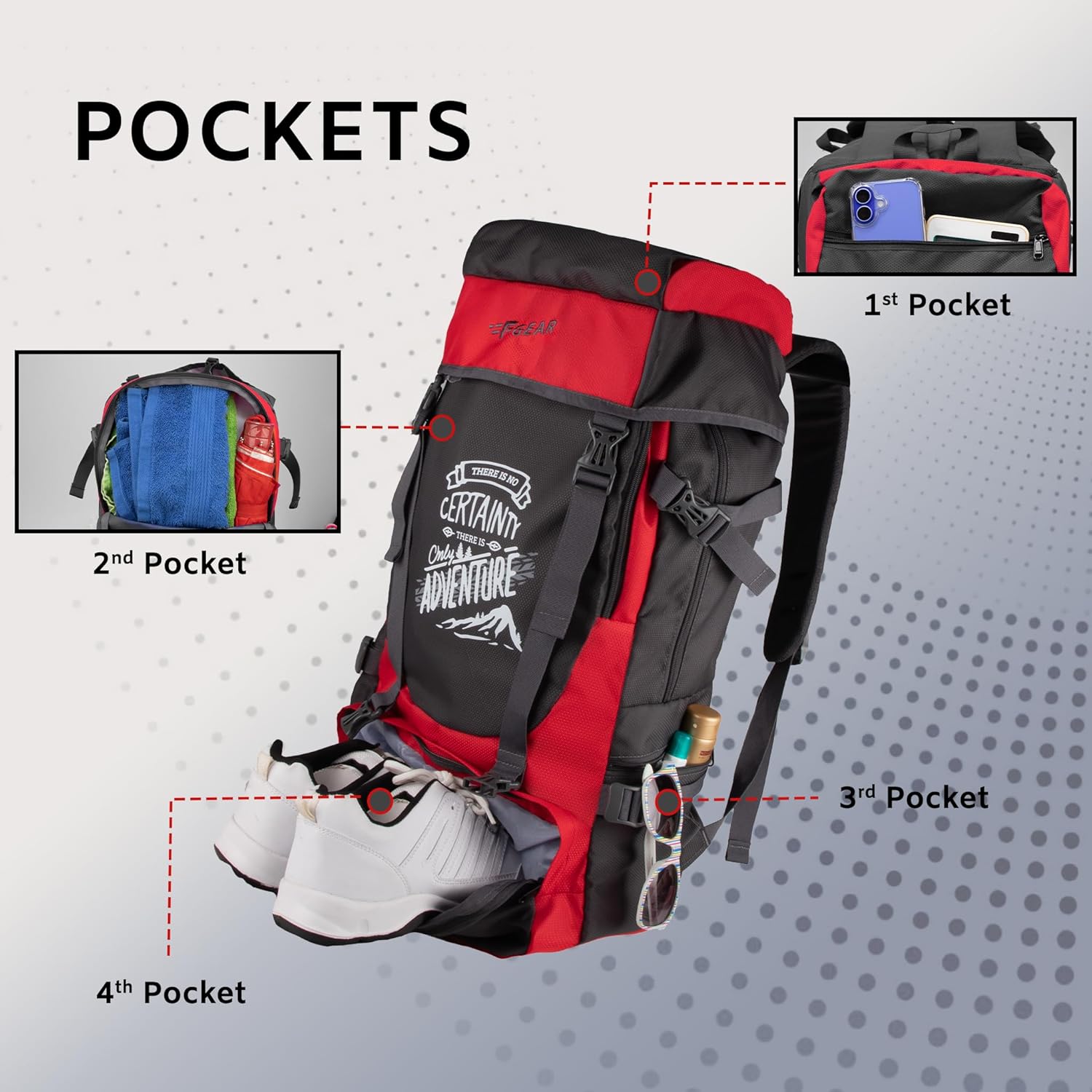 Introducing the F Gear Ridge rucksack, the ideal companion for outdoor enthusiasts who seek both functionality and durability. It features a main long zipper compartment for ample storage, a front pocket for easy access, and a separate shoe pocket at the bottom. With a side bottle holder and a side zipper pocket, it ensures convenient hydration and secure storage. The top hood pocket provides additional space, while the padded waist strap and back panel enhance comfort during extended use. Compression straps on both sides keep your belongings secure and stable. Ideal for hiking, traveling, or daily use, this rucksack is your go-to companion for all your adventures.