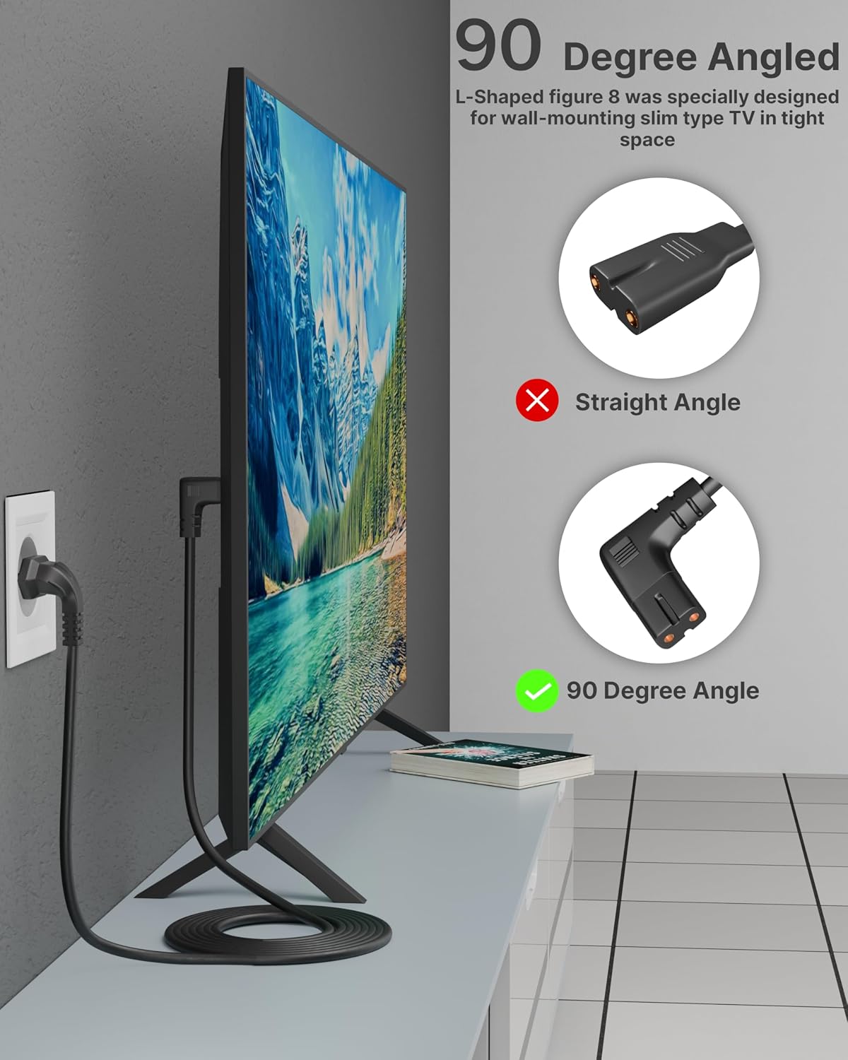 ▶SPACE UTILIZATION AND HUMANIZED DESIGN – The 90 degree angled slot and L-shaped figure 8 was speciallly designed for wall-mounting slim type TV in tight space. With this power cable, you can move your TV as close as possible to the wall meanwhile greatly protect your cord from bending. Powerful, beautiful and generous, it is an excellent choice for your bold innovation.