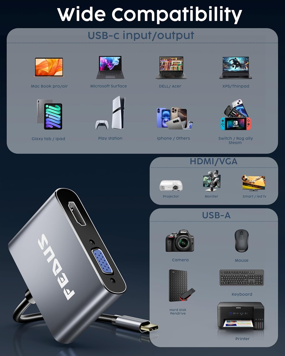 FEDUS USB Hub Type C Hub, USB C Hub, USB Type C to 4K HDMI VGA adapter Converter, Type C to USB 3.0@5gbps Type a Converter With 65W Power Delivery for MacBook Pro/Air,iPhone,Phones,Tablets,Pc Computer
