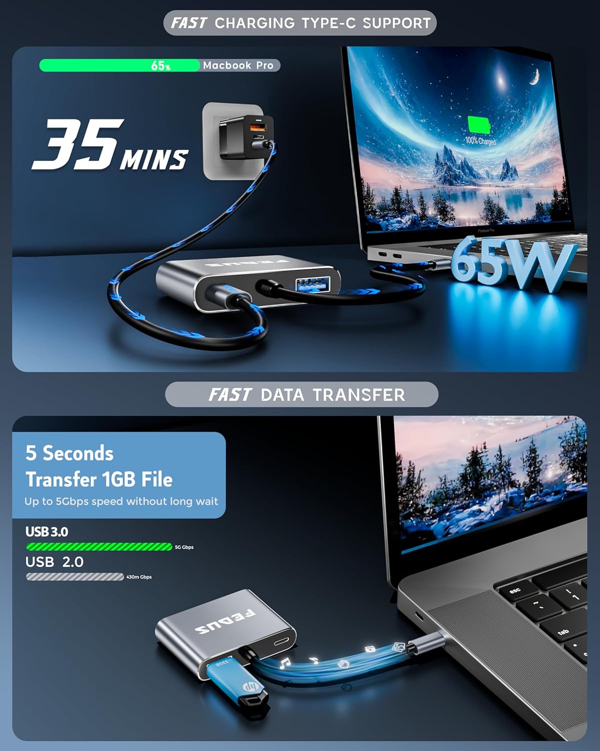 ▶SUPER SPEED USB A 3.0 PORT: The USB 3.0 port supports data transmission, OTG, which provides the highest peak data transfer speed of up to 5 Gbps, making it easy to transfer HD movies quickly. Connect your USB disk, camera, removable hard drive, mouse, keyboard, or other USB peripherals to a laptop, mobile device, or MacBook Pro. It is backward compatible with USB 2.0/1.1, suitable for more USB devices. Note: The USB A port does not support charging.