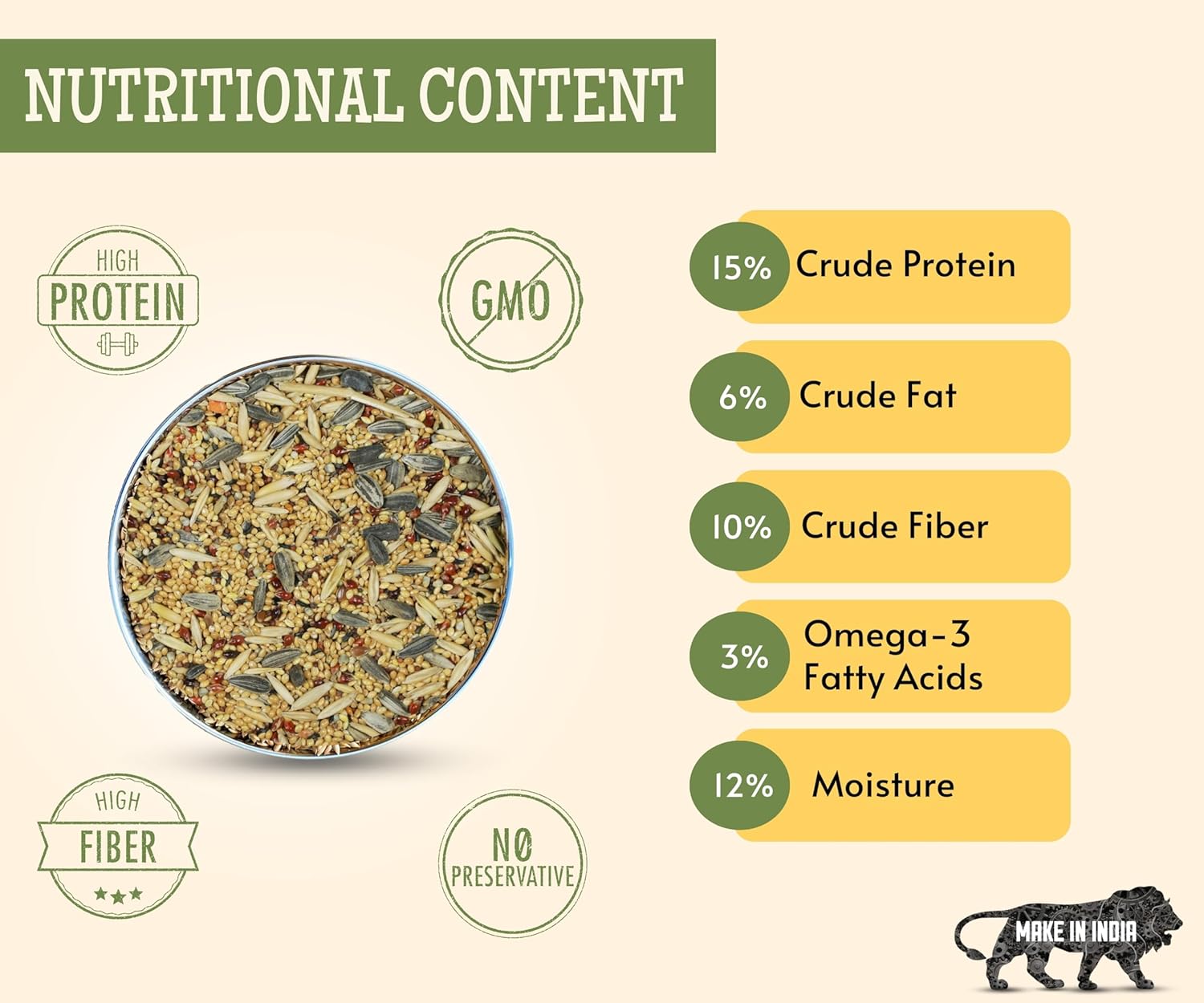 NATURAL INGREDIENTS: This mixed seed is fortified with Foxtail, Green Proso, Yellow Proso, Browntop, Sunflower, Niger, Oats, Red Sorghum, Pearl, Imported Canary Seed, Ragi, Imported Black, Imported Red.