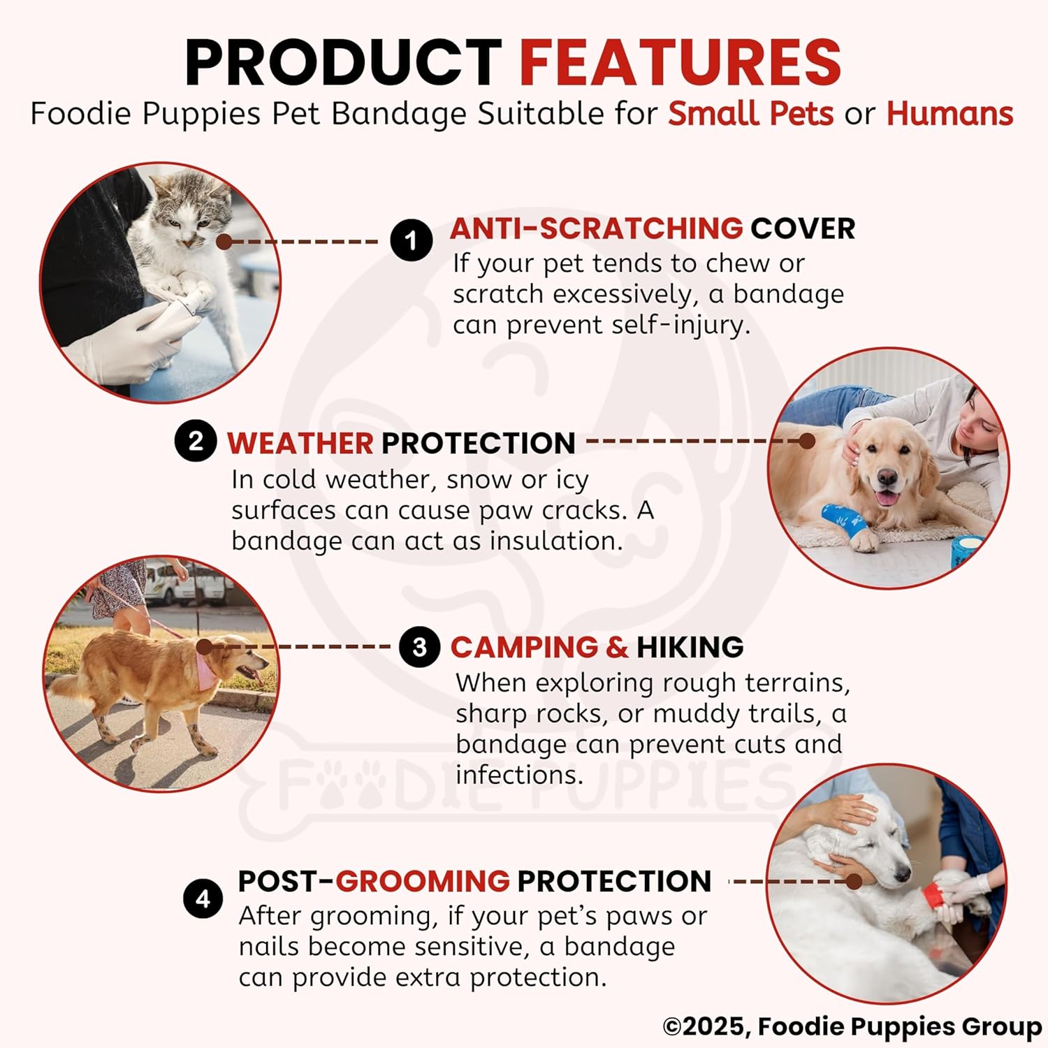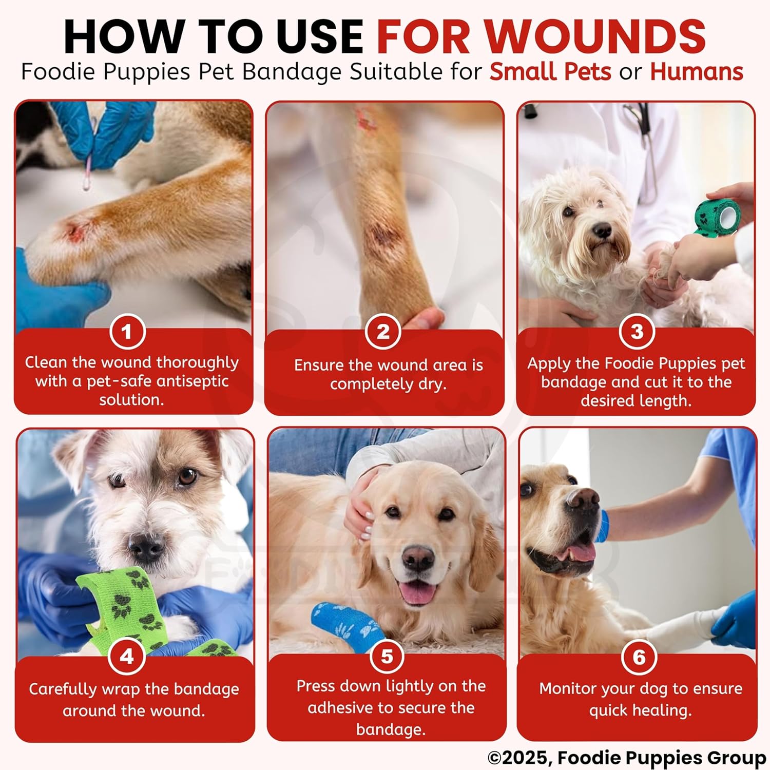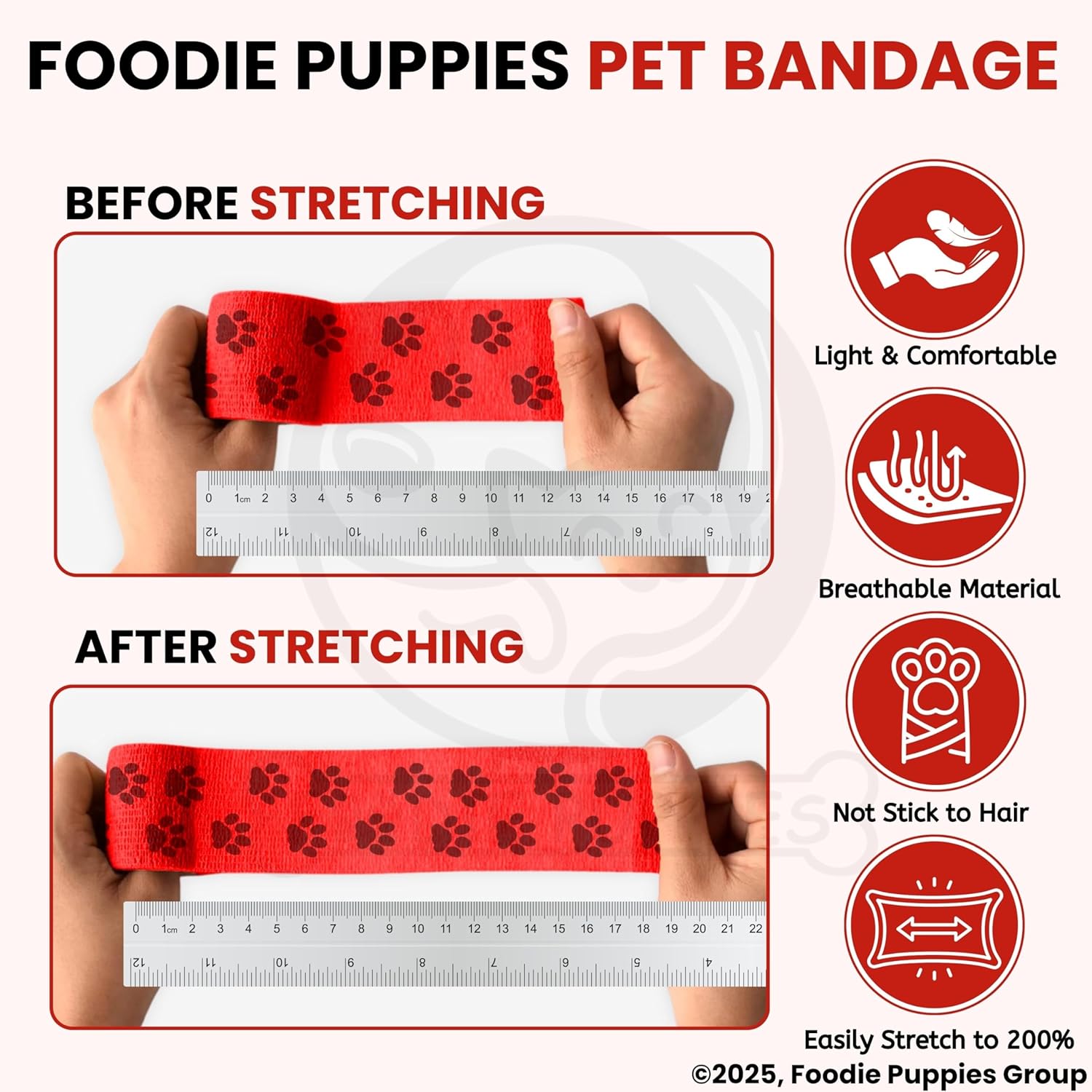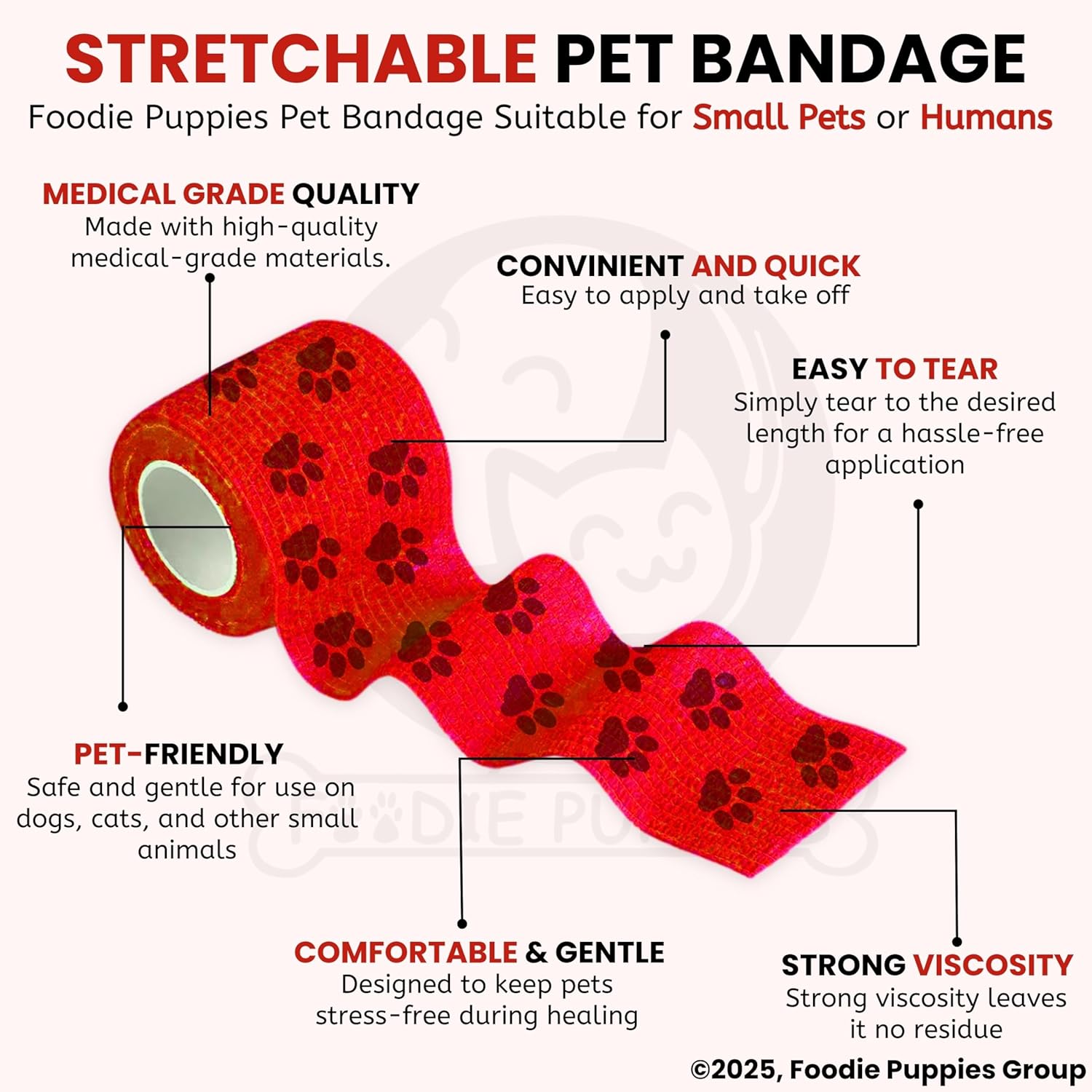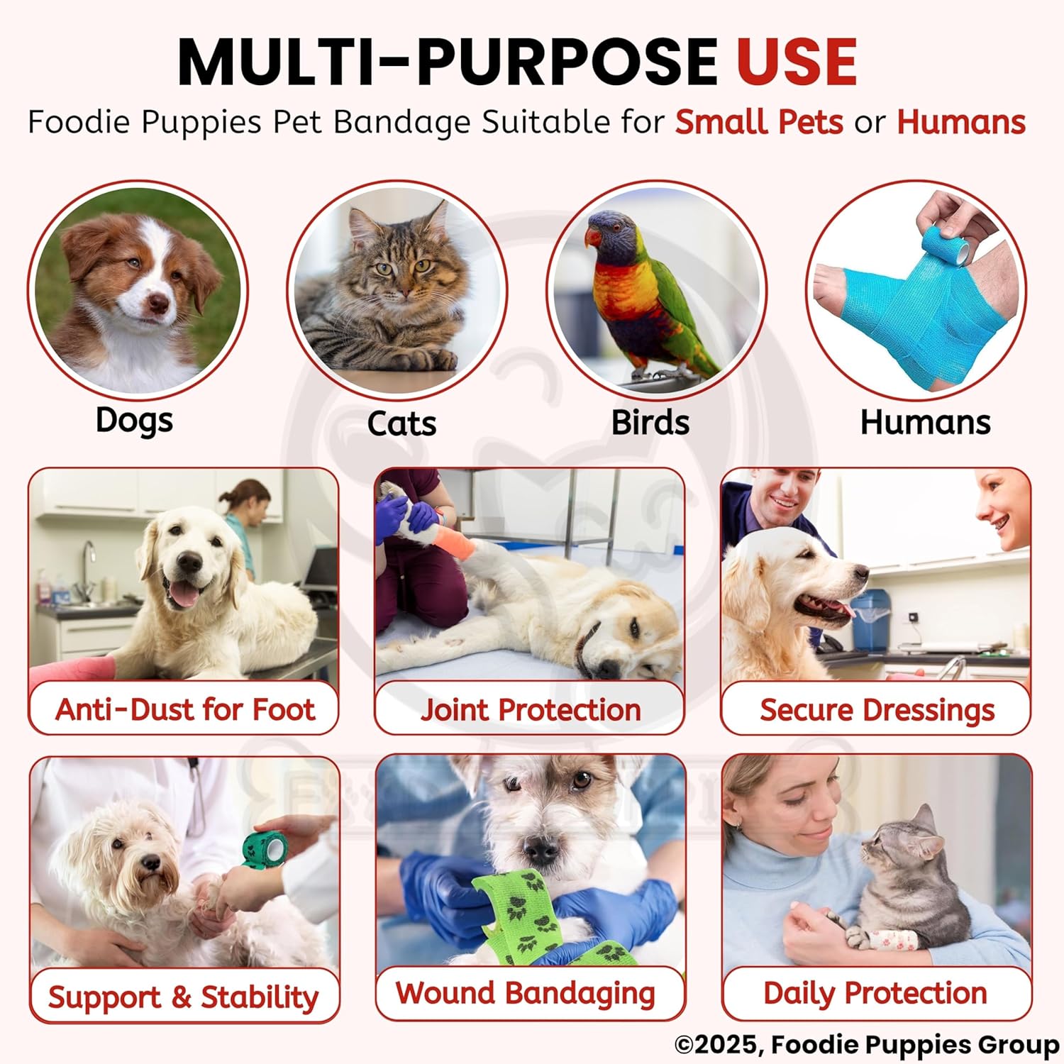 Foodie Puppies Vet Wrap Tape Bandages – the globally recognized choice for self-adherent bandaging tape, trusted by pet owners, veterinarians, and animal lovers worldwide. Each roll is meticulously individually wrapped, ensuring freshness and convenience for your furry companions. Our self-stick Vet Tape is an essential addition to your pet’s first aid kit, available in a delightful array of vibrant colors that make healing a little more cheerful. Whether you have dogs, cats, small pets, large pets, or even horses, our versatile vet wrap is designed to cater to all their needs. What sets our vet wrap apart is its ease of use. It can be effortlessly cut or torn, making it incredibly user-friendly. This makes it an ideal choice for all-around medical wrapping and wound care. Our elastic bandages are not only user-friendly but also exceptionally robust, offering superior support for your pet’s injuries. When applied, this bandage exerts the right amount of pressure to control bleeding effectively. Plus, it boasts the flexibility needed to ensure it won’t compromise circulation when used in conjunction with padding or gauze. One of the standout features cherished by veterinarians and pet owners alike is its self-adherent quality. This means that the vet wrap tape adheres to itself without the need for clips or fasteners, making the application process hassle-free and comfortable for your pet. Foodie Puppies Vet Wrap Tape Bandages are more than just a first aid supply; they are a symbol of care and commitment to your pet’s well-being. Trust in the brand known worldwide for its reliability and quality. Whether you’re addressing minor wounds, or sprains, or just want to add a pop of color to your pet’s bandage, our vet wrap tape is the ideal choice. Choose Foodie Puppies and wrap your pet in comfort and care.