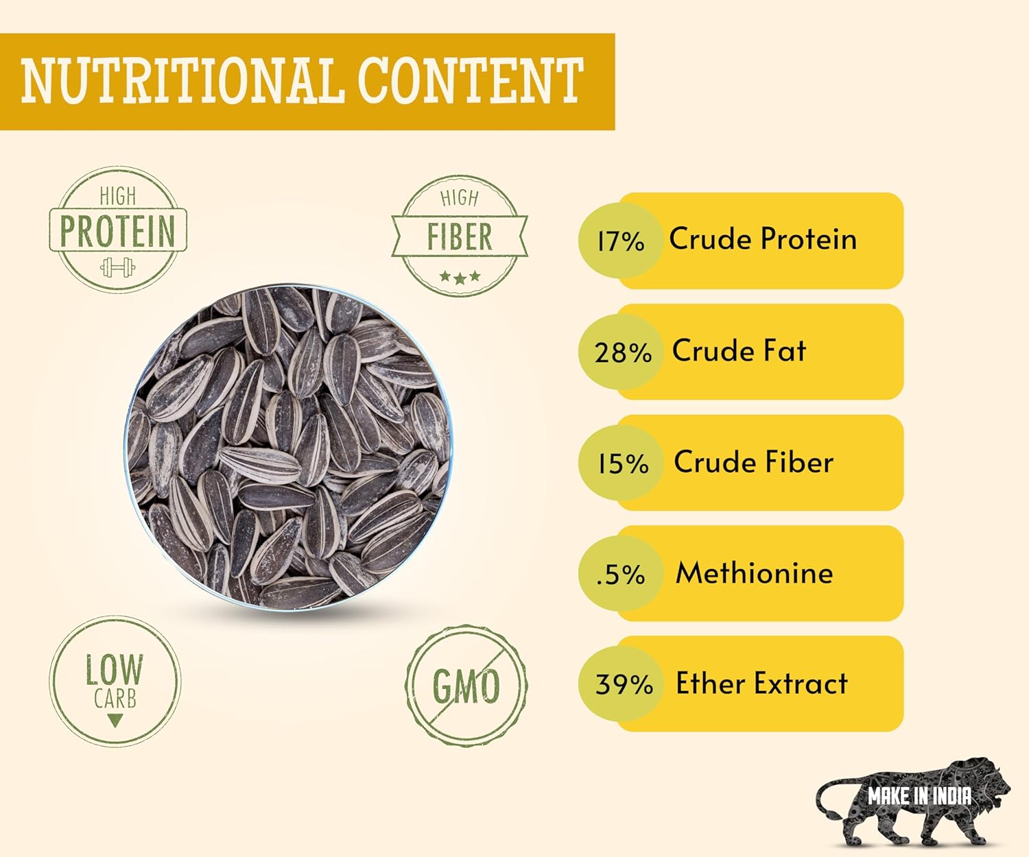 NUTRITIONAL CONTENT: 17% Crude Protein, 28% Crude Fat, 15% Crude Fiber, 0.5% Methionine, 39% Ether Extract