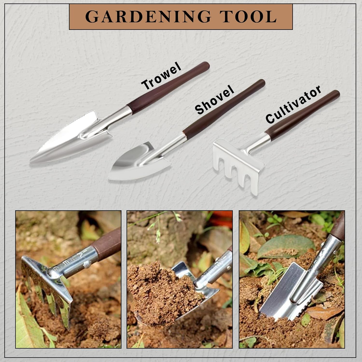 GLUN® Garden Hand Tools 3 Pieces of Mini Garden Tools Trowel, Shovel, Cultivator, Outdoor and Indoor Portable Tool Set for Digging, Weeding, Planting