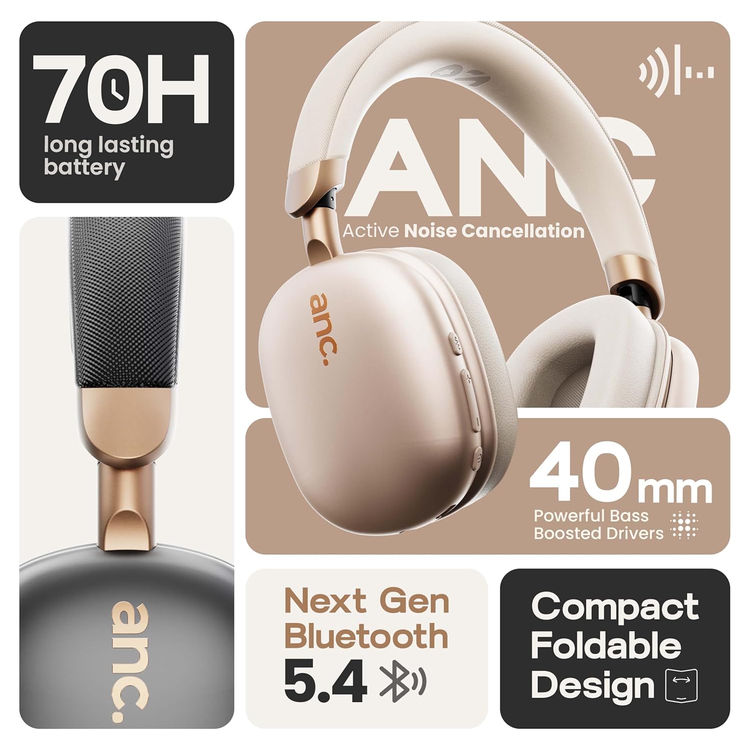 GOBOULT (Formerly Boult Newly Launched Fluid X Pro Ear Bluetooth Headphones with 70H Playtime, 40mm Bass Drivers, Zen™ ENC Mic, Type-C Fast Charging, 4 EQ Modes, AUX, IPX5 Wireless Headphones(Beige)