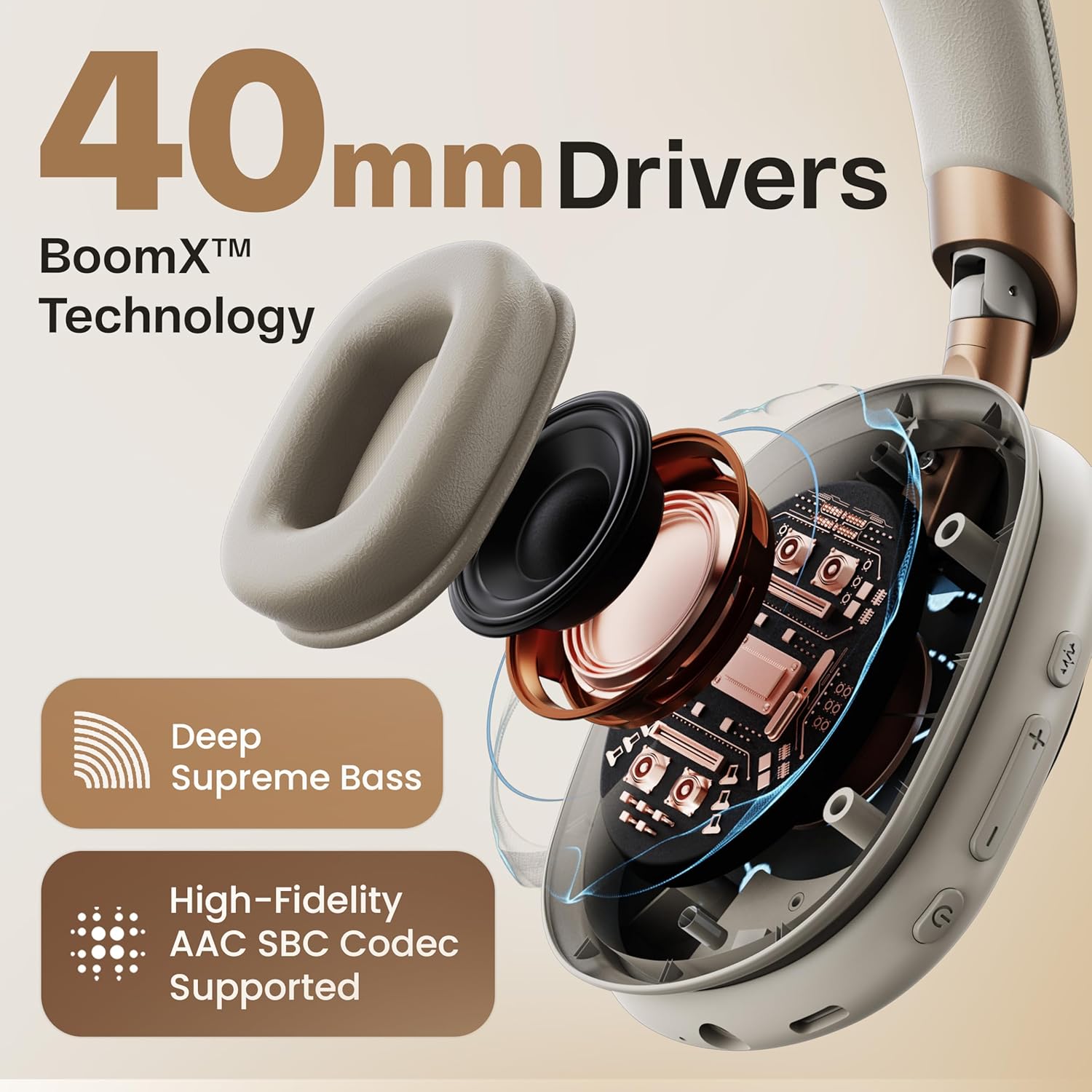 GOBOULT Newly Launched Fluid X Headphones Bluetooth Wireless with 60H Playtime, 40mm Bass Driver, Zen ENC Mic, Type-C Charging, Combat™Gaming Mode, BTv 5.4, Headphones Wireless with mic (White)