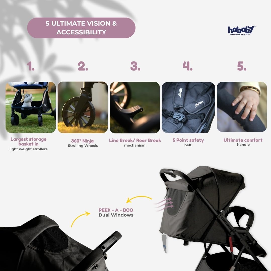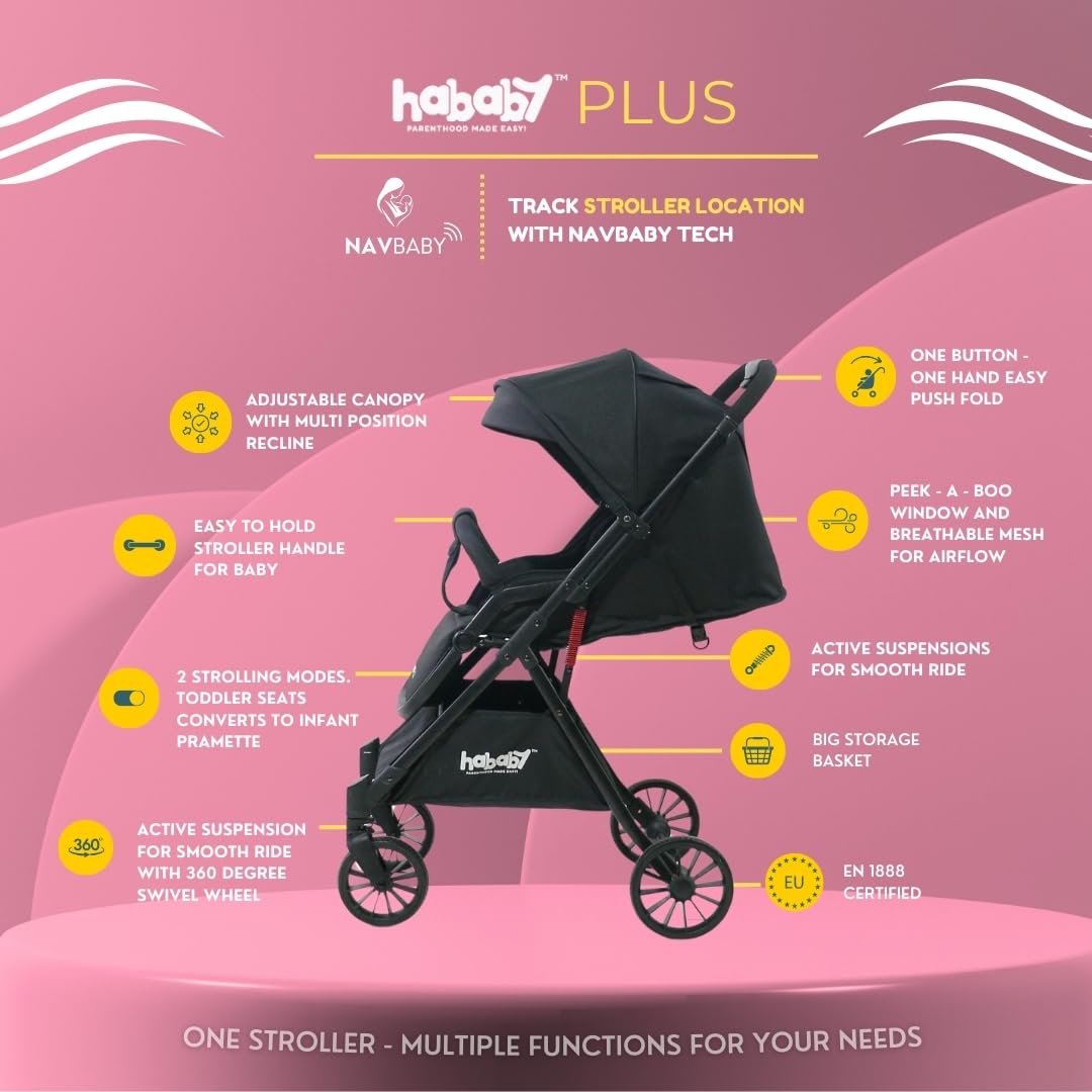 Hababy Plus with NavBaby GPS – European Certified Baby Pram/Stroller (Black) 0-3 Years – Foldable, Lightweight Pram with 360 Wheels, Suspensions – Ideal Compact Travel Trolley for Boys & Girls