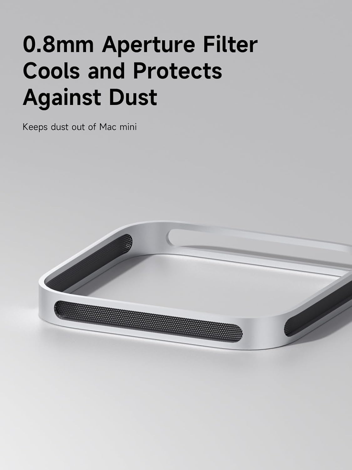 Dust Proof & Heat Dissipation: The rear vent is equipped with a dust-proof filter net, which ensures both bottom ventilation and heat dissipation. The air inlet is equipped with a 0.8mm aperture dust filter to effectively prevent dust accumulation inside the Mac mini