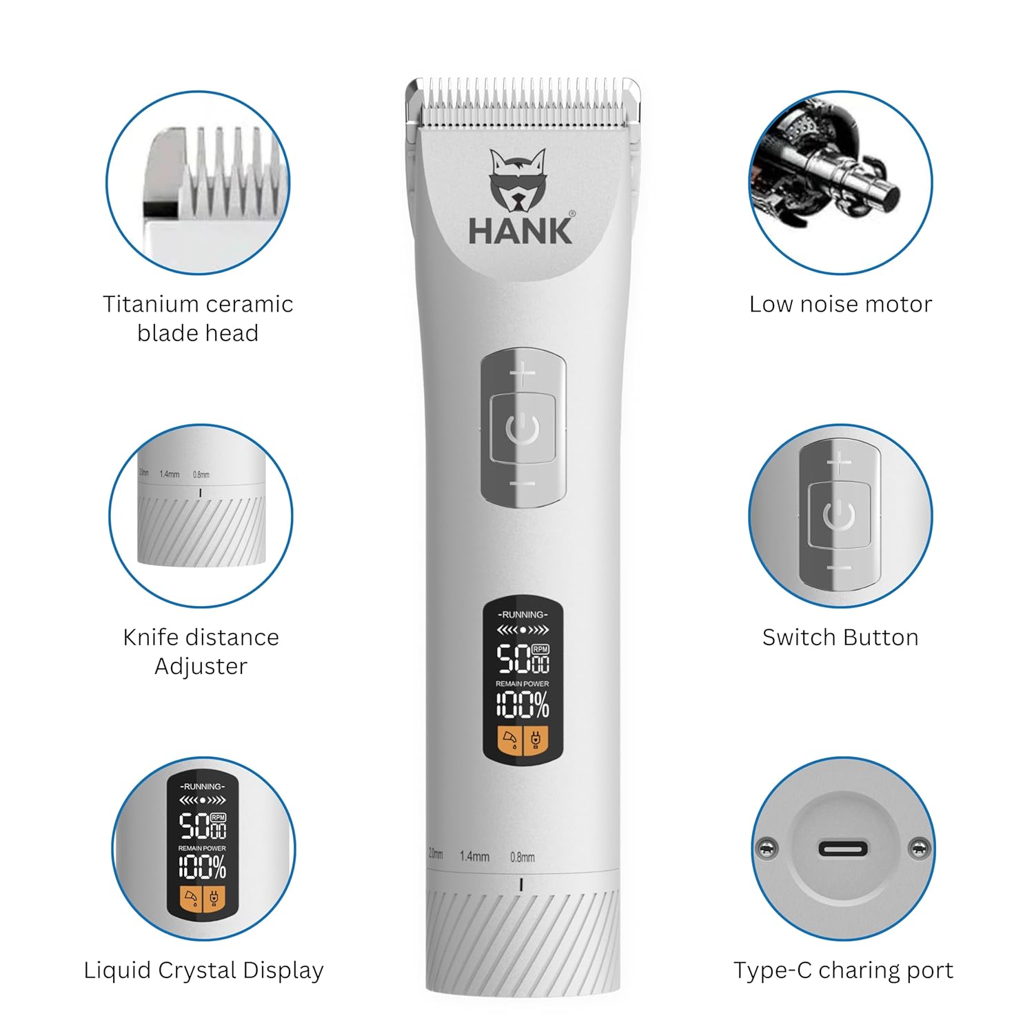 HANK Dog Hair Trimmer – Pet Hair Clipper – Grooming Kit – Titanium Blade – LCD Display – Cordless – 3 Speed Mode – Low Noise – Rechargeable Thick Hair Cutting Machine