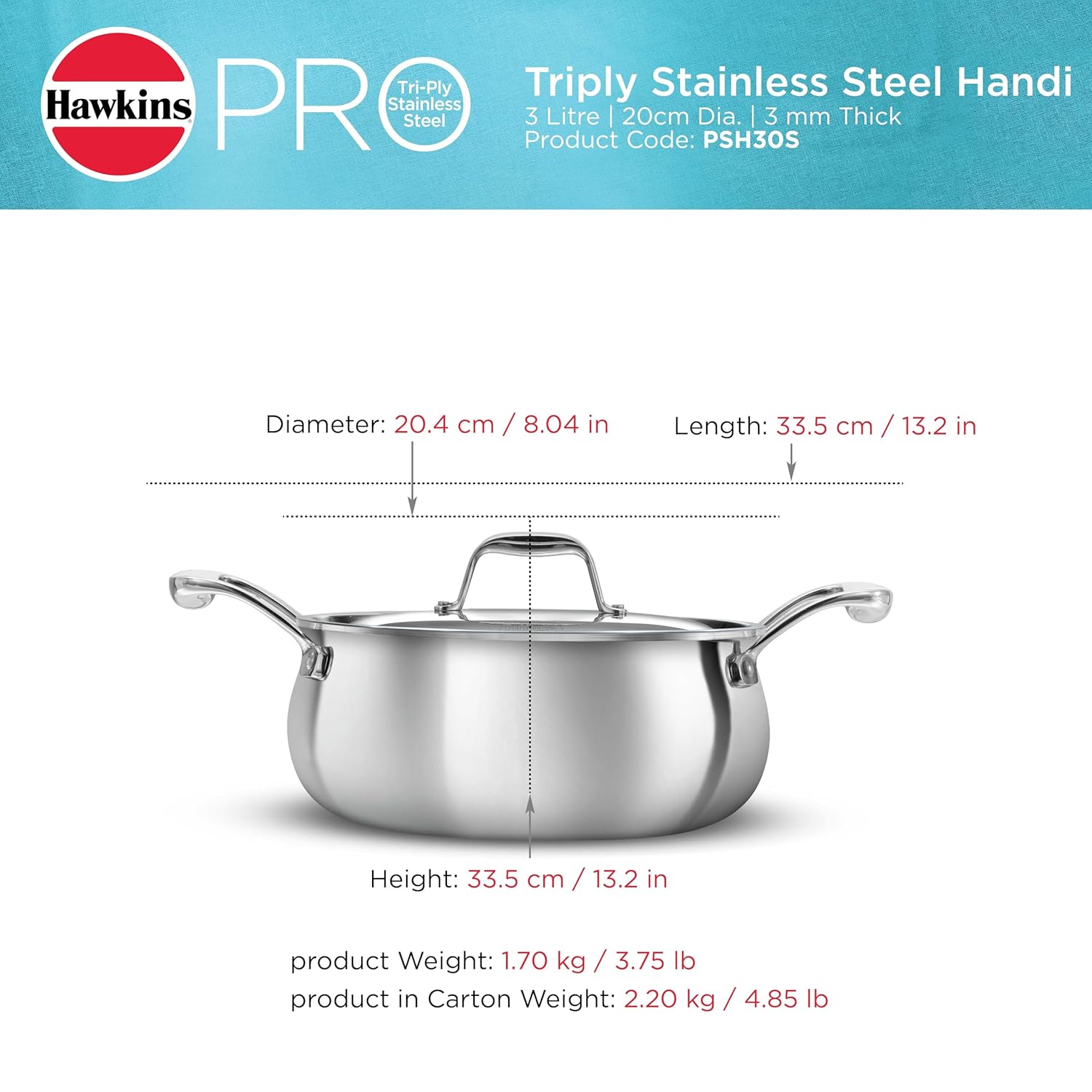 Hawkins 3L Pro Triply Stainless Steel Handi with Steel Handles and Steel Lid, Silver (PSH30S)