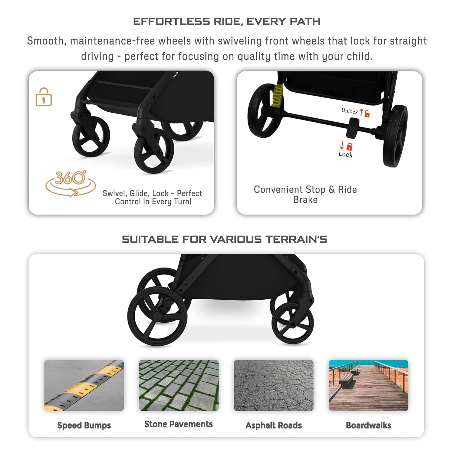 Compact and Maximum storage: Our lightweight (9.5kg) infant stroller with a corrosion-resistant frame and PU leather handle for easy, one-handed use. Features ultra-compact folding, XL basket, dual cup holders, and a large PU wheel system for all terrains. Advanced shock absorption and damping springs ensure comfort, while lockable front wheels and rear brakes provide safety and smooth maneuvering wherever you go.